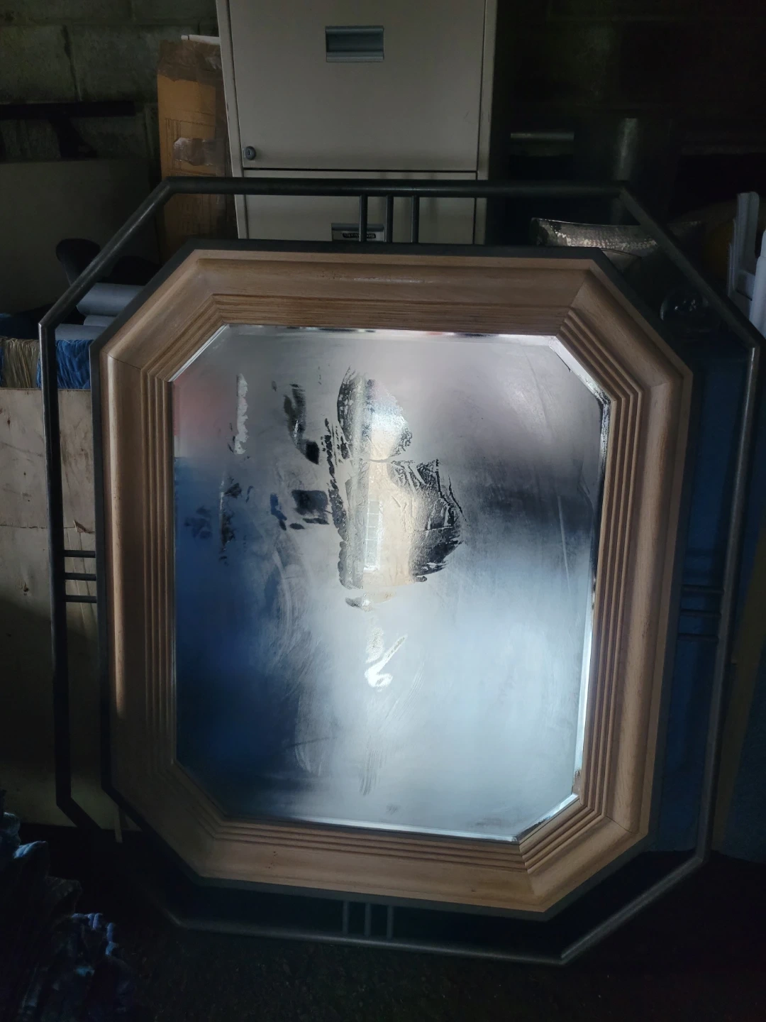 An octagonal mirror with a wood-toned frame and a decorative metal accent. It's a statement piece for any room. The frame has a grooved design.