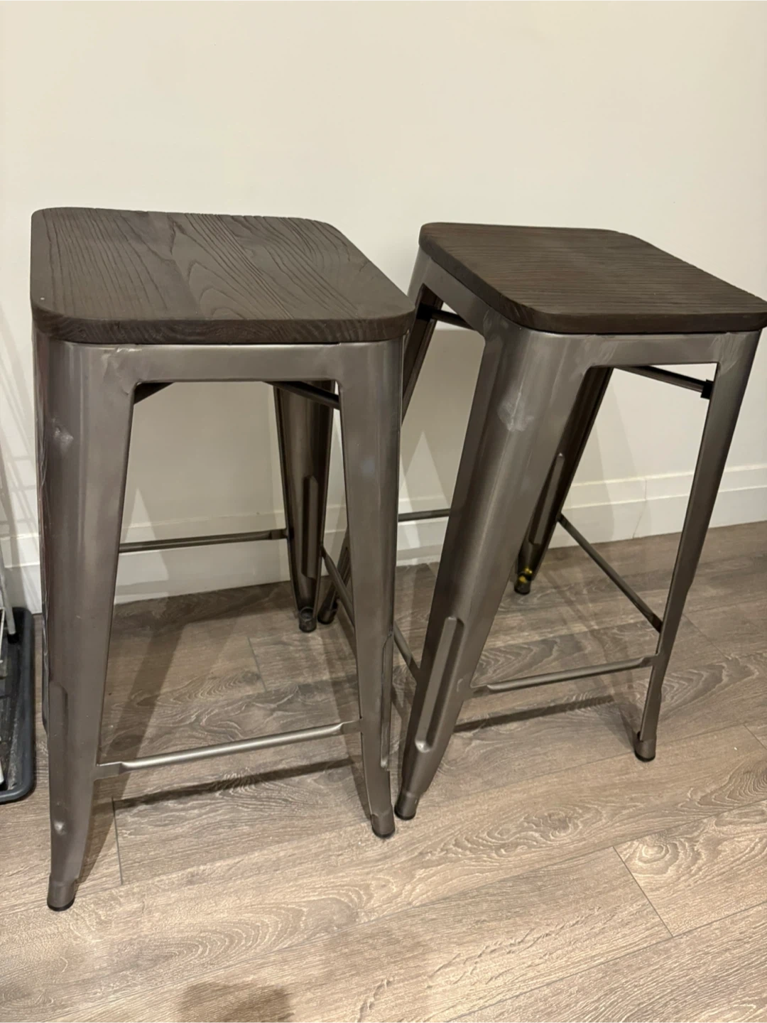 Two counter height bar stools featuring a distressed metal base and a dark wood grain seat. These stools have a sturdy construction, perfect for a kitchen island or bar area.