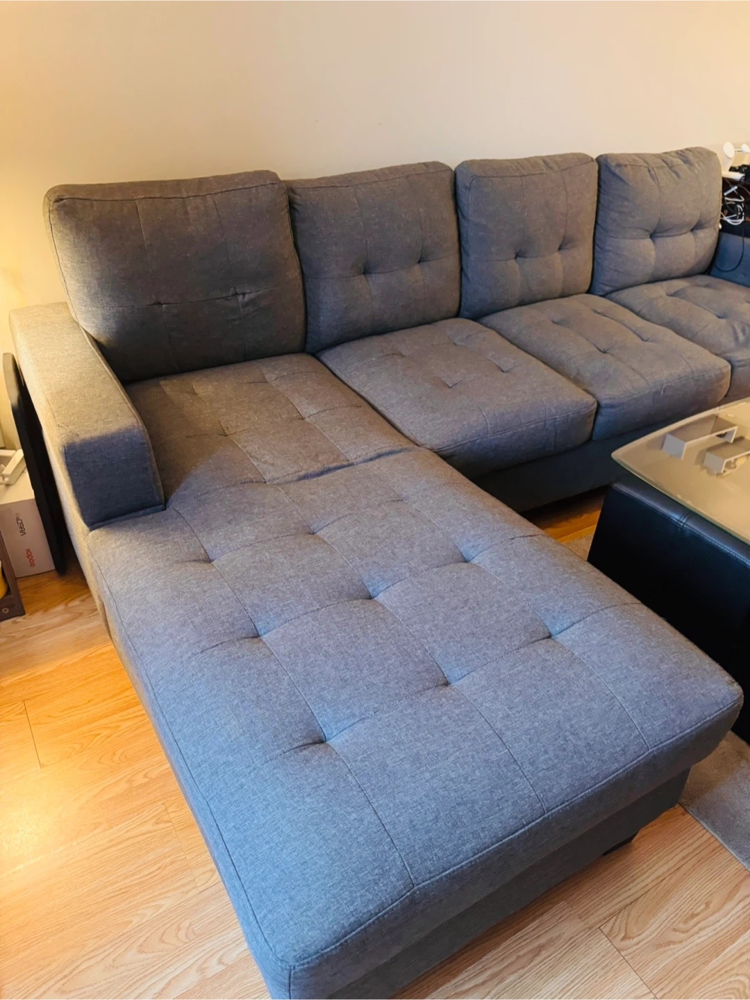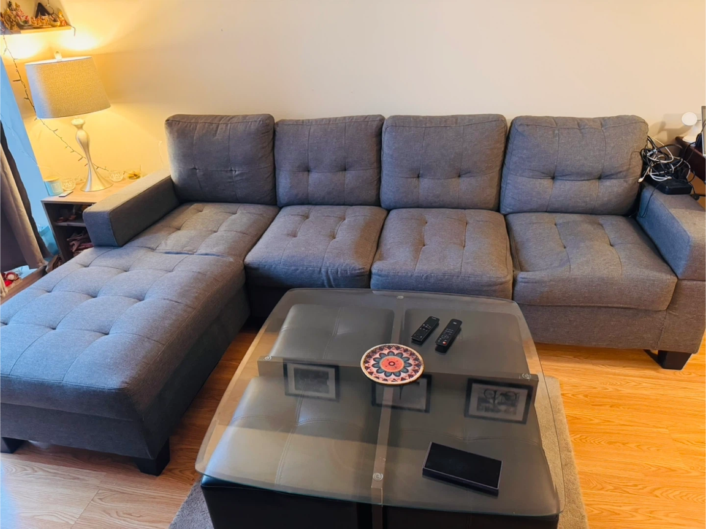 Comfortable grey sectional sofa with chaise and built-in storage.