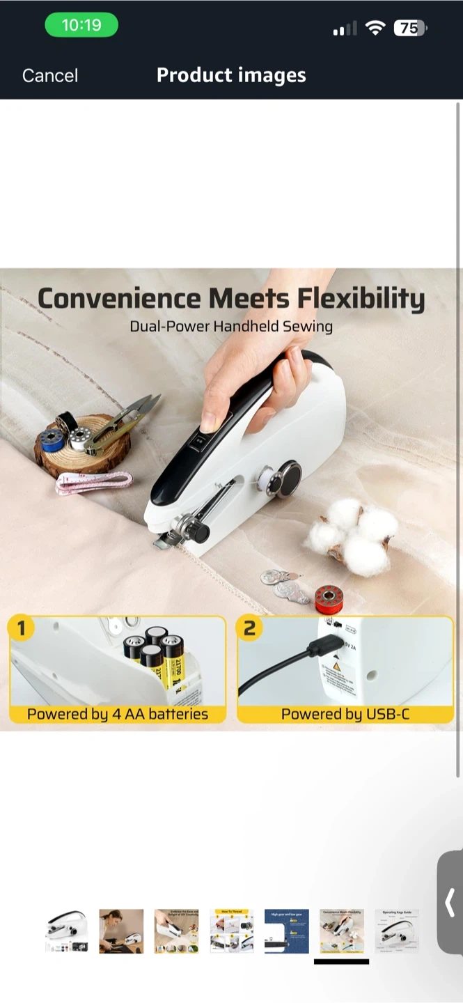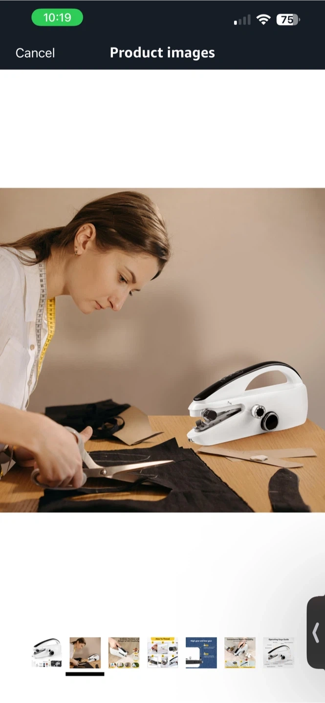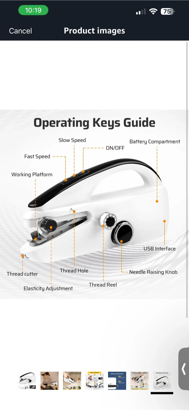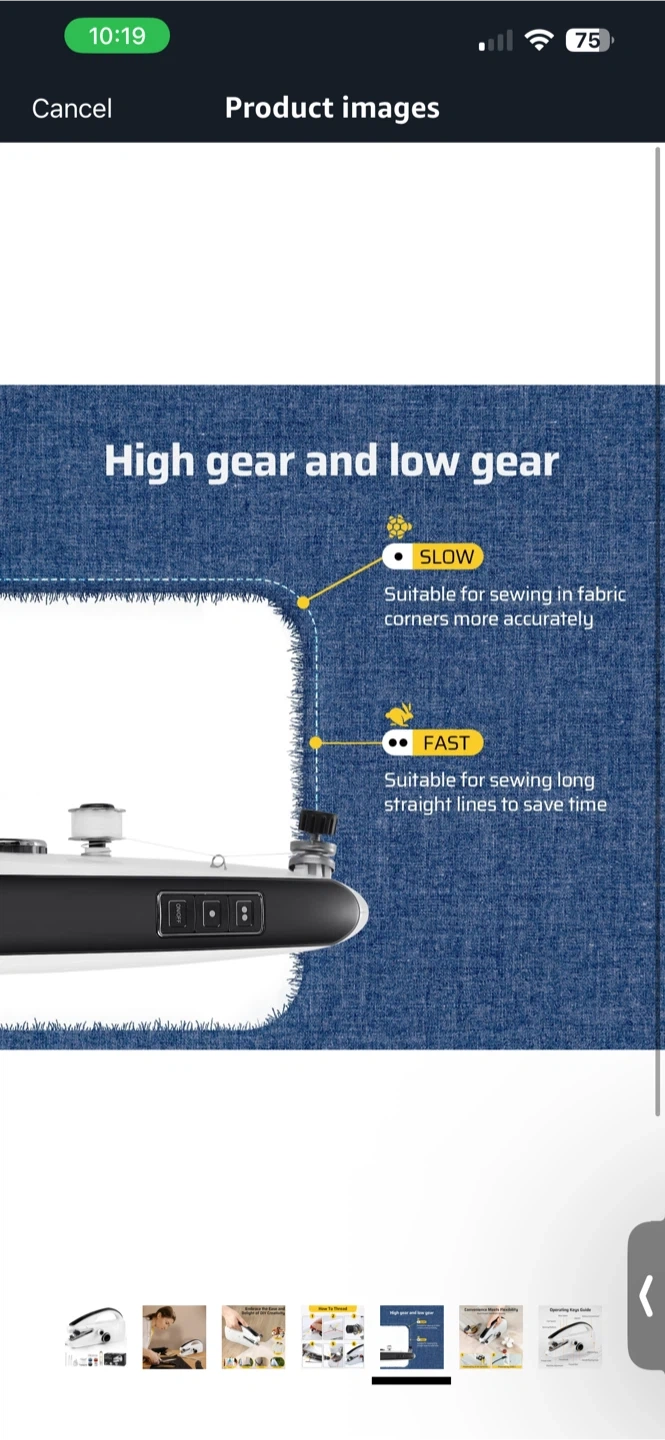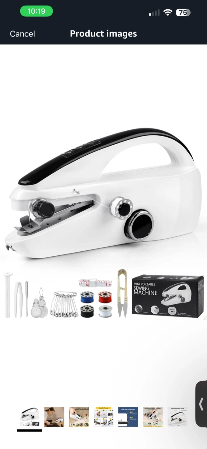 This is a mini portable sewing machine. It has high and low gear settings for sewing accuracy or speed. Includes bobbins, scissors, and a measuring tape.