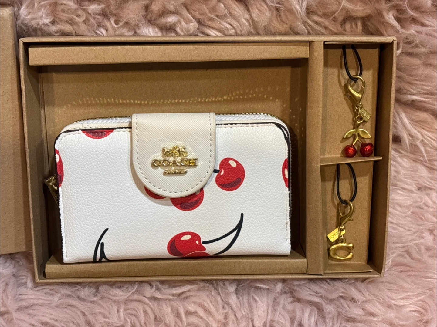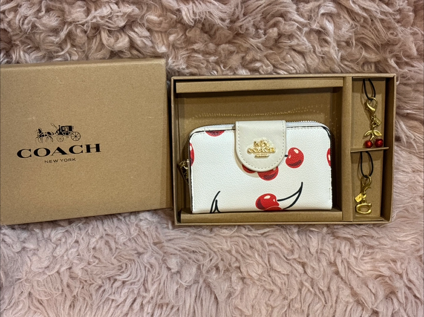 Selling a brand new Coach small wallet with a cute cherry print! It comes with a matching charm set and the original box. This adorable wallet is perfect for adding a touch of fun to your everyday style