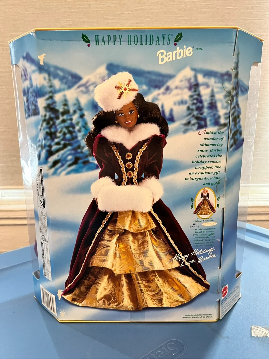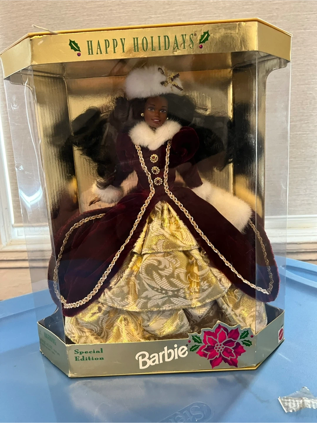 This is the Happy Holidays Barbie Doll, a Special Edition. The doll is dressed in a festive burgundy and gold gown with faux fur trim. It comes in its original box.