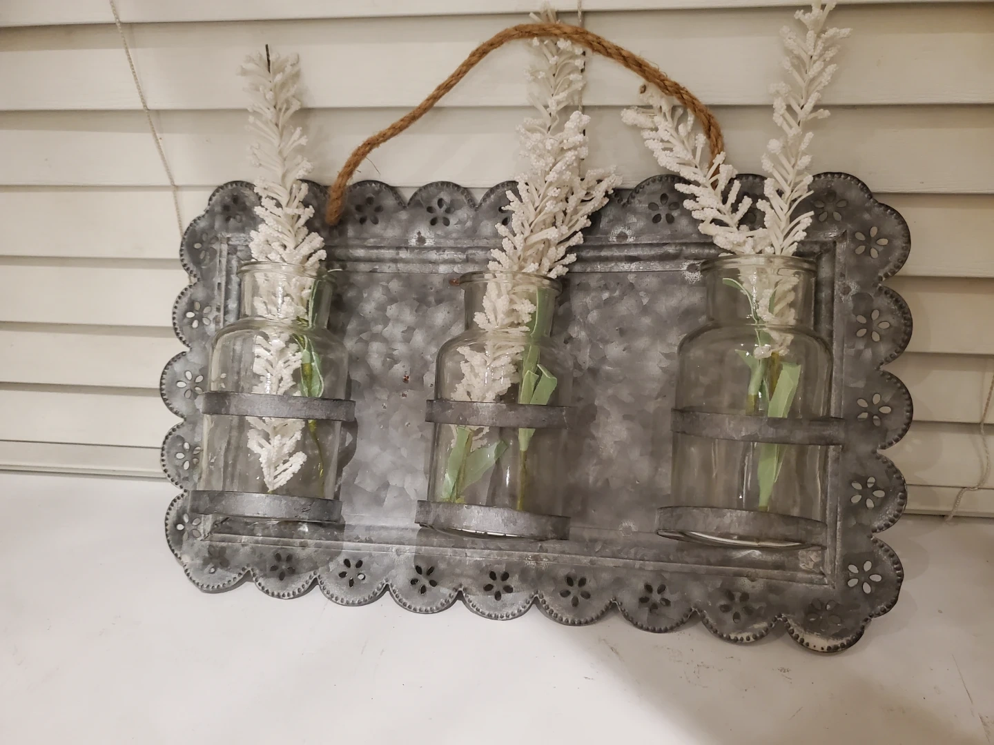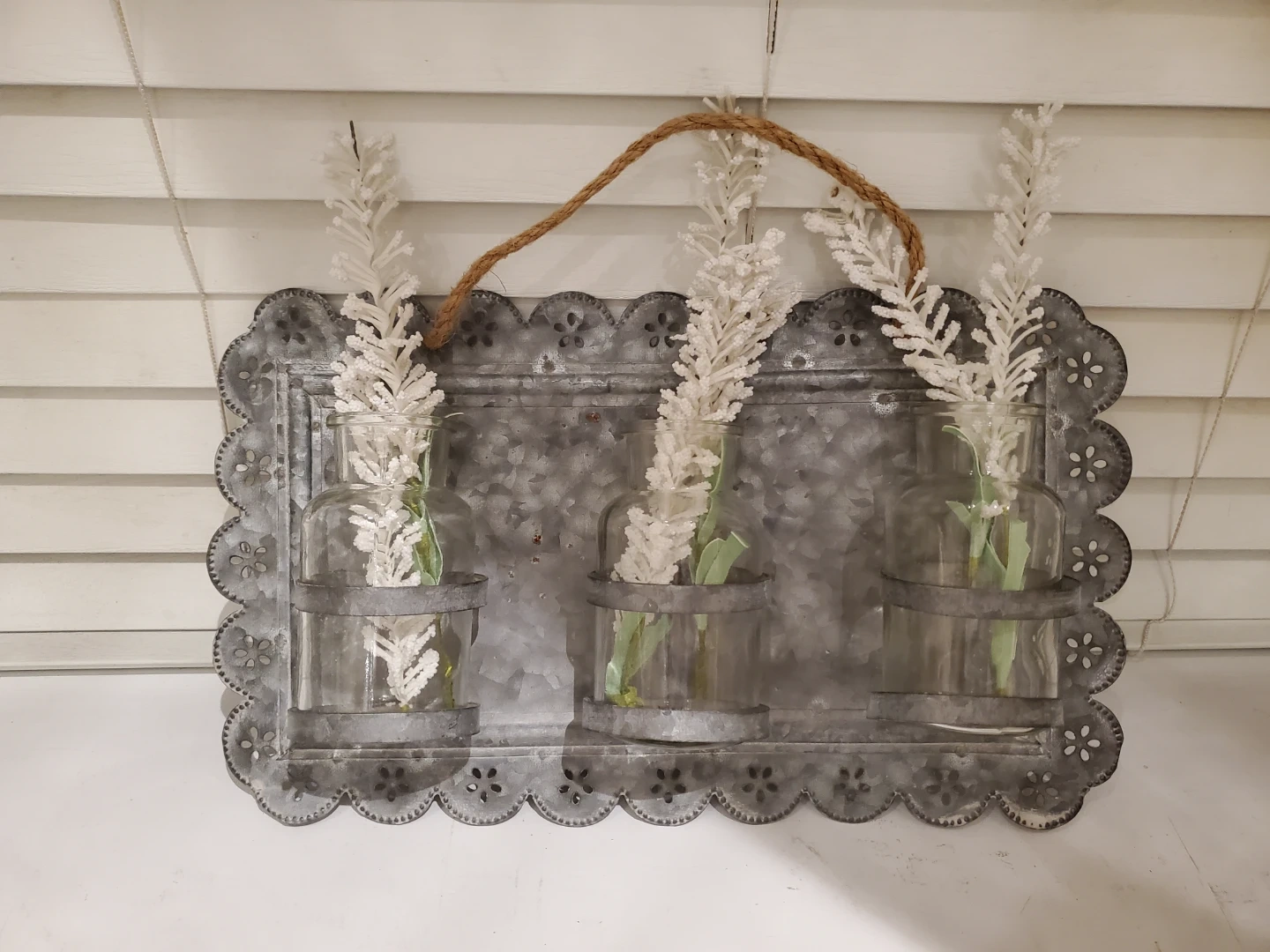 Rustic galvanized metal wall art featuring three clear glass vases. Each vase is secured with a metal band and holds faux white floral stems. It's ready to hang with a rope twine.