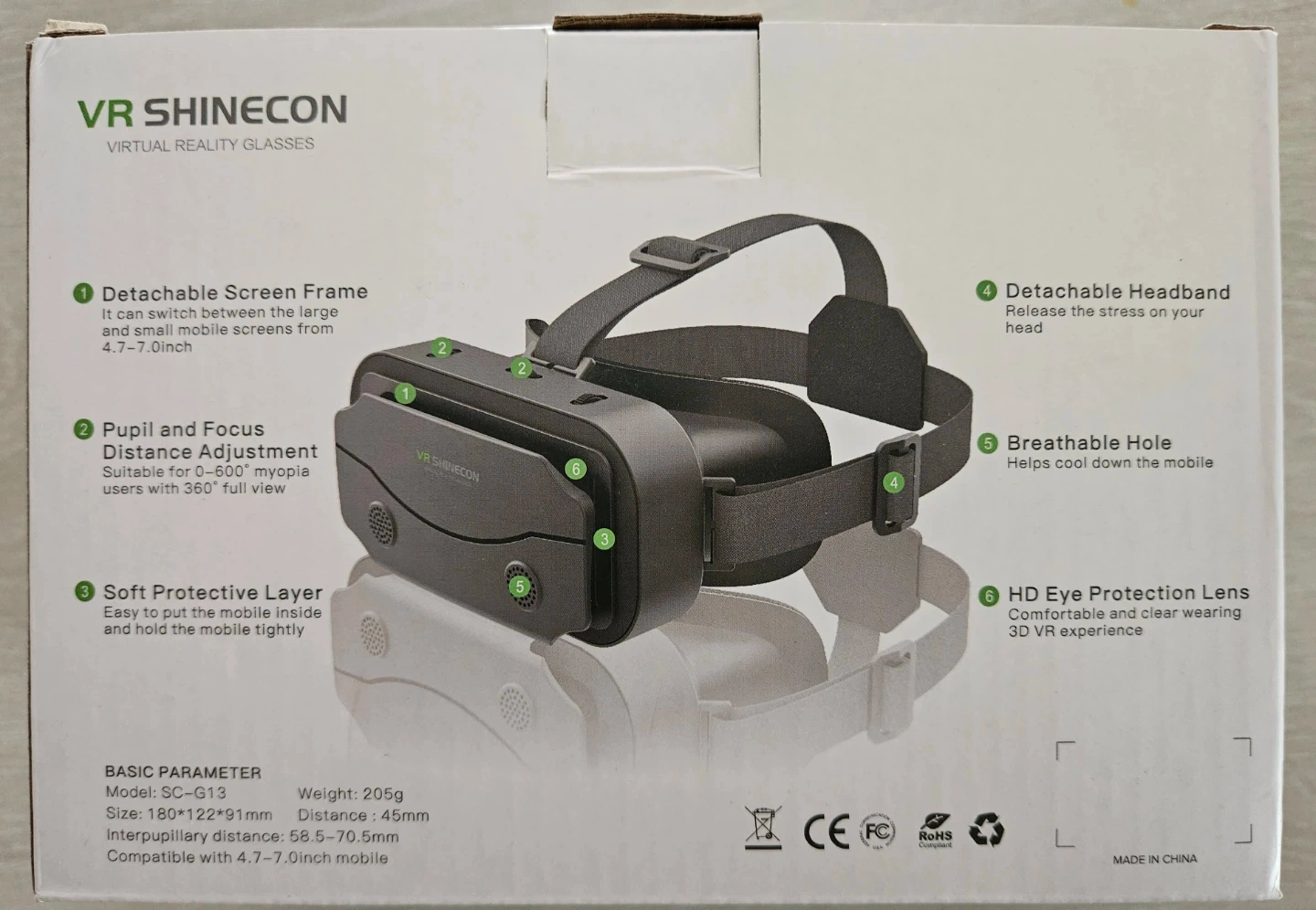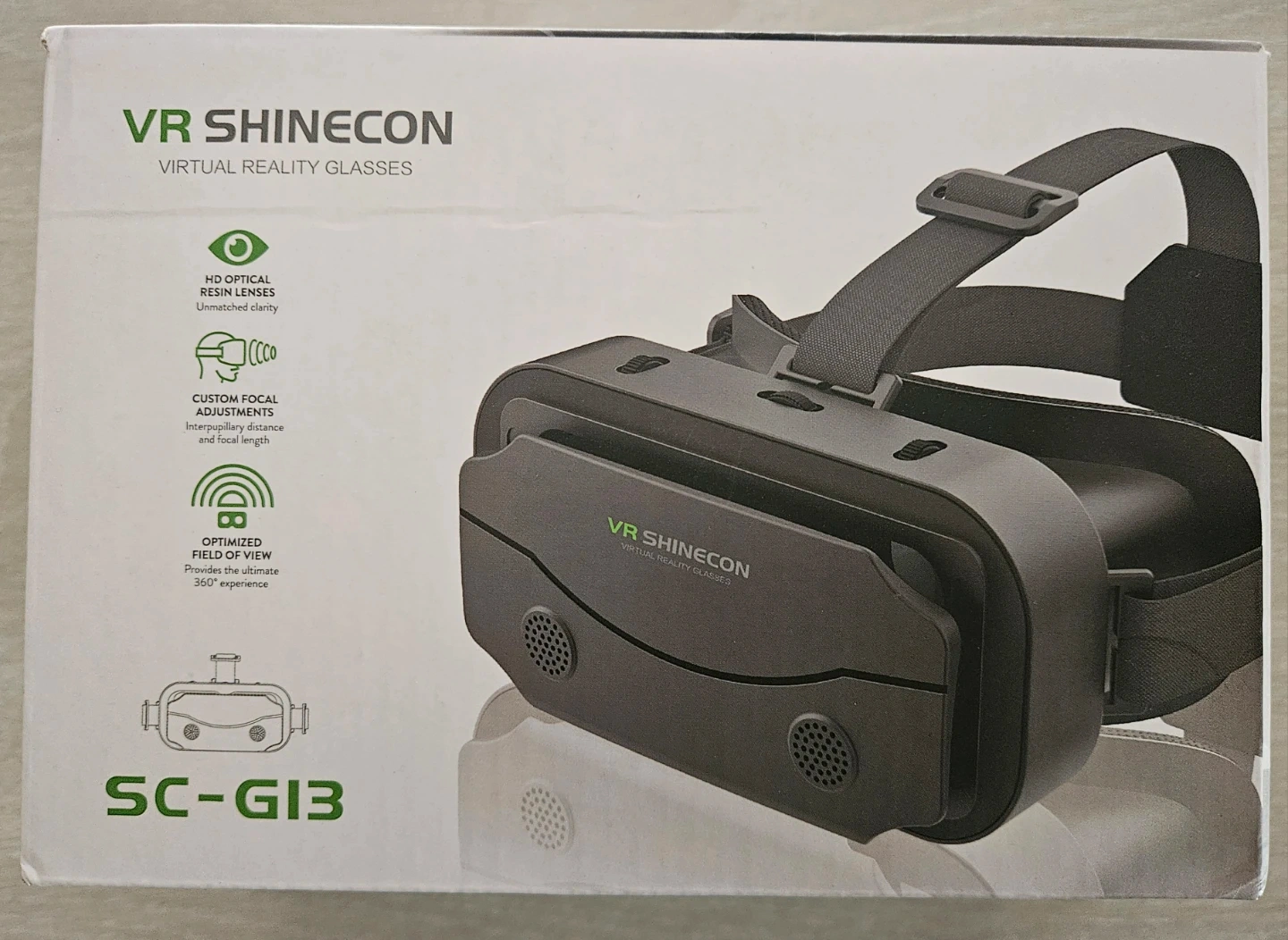 This is a VR Shinecon SC-G13 virtual reality headset. It features HD optical resin lenses and custom focal adjustments for a comfortable viewing experience. Compatible with smartphones from 4.7-7.0 inches. Includes a detachable headband and breathable holes for cooling.