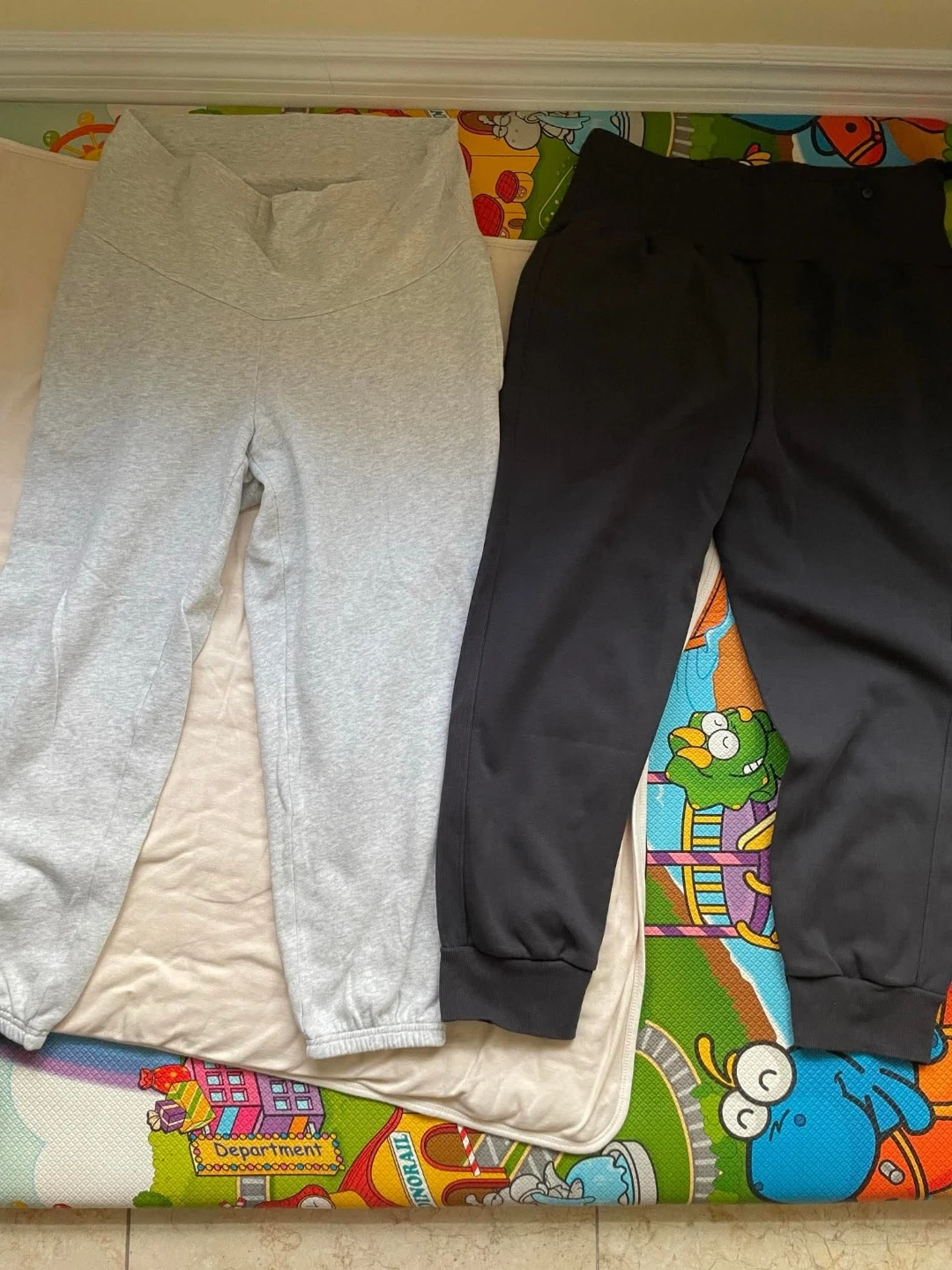 Two pairs of comfortable sweatpants, one in grey and one in black. Both are made from a soft, stretchy material, perfect for lounging or active days. Elastic waistband and cuffs for a snug fit in pregnancy.