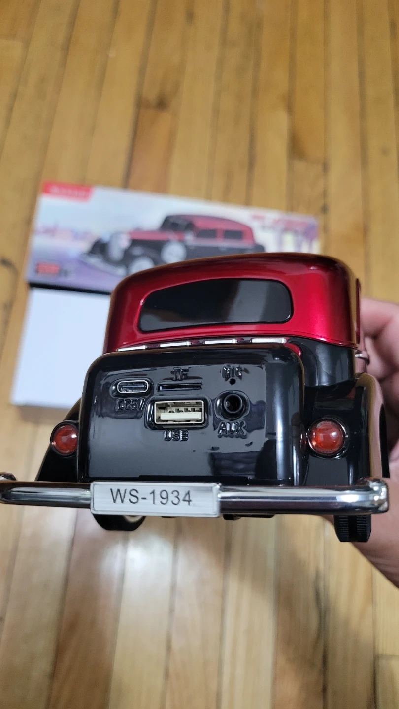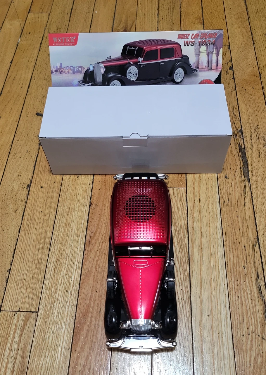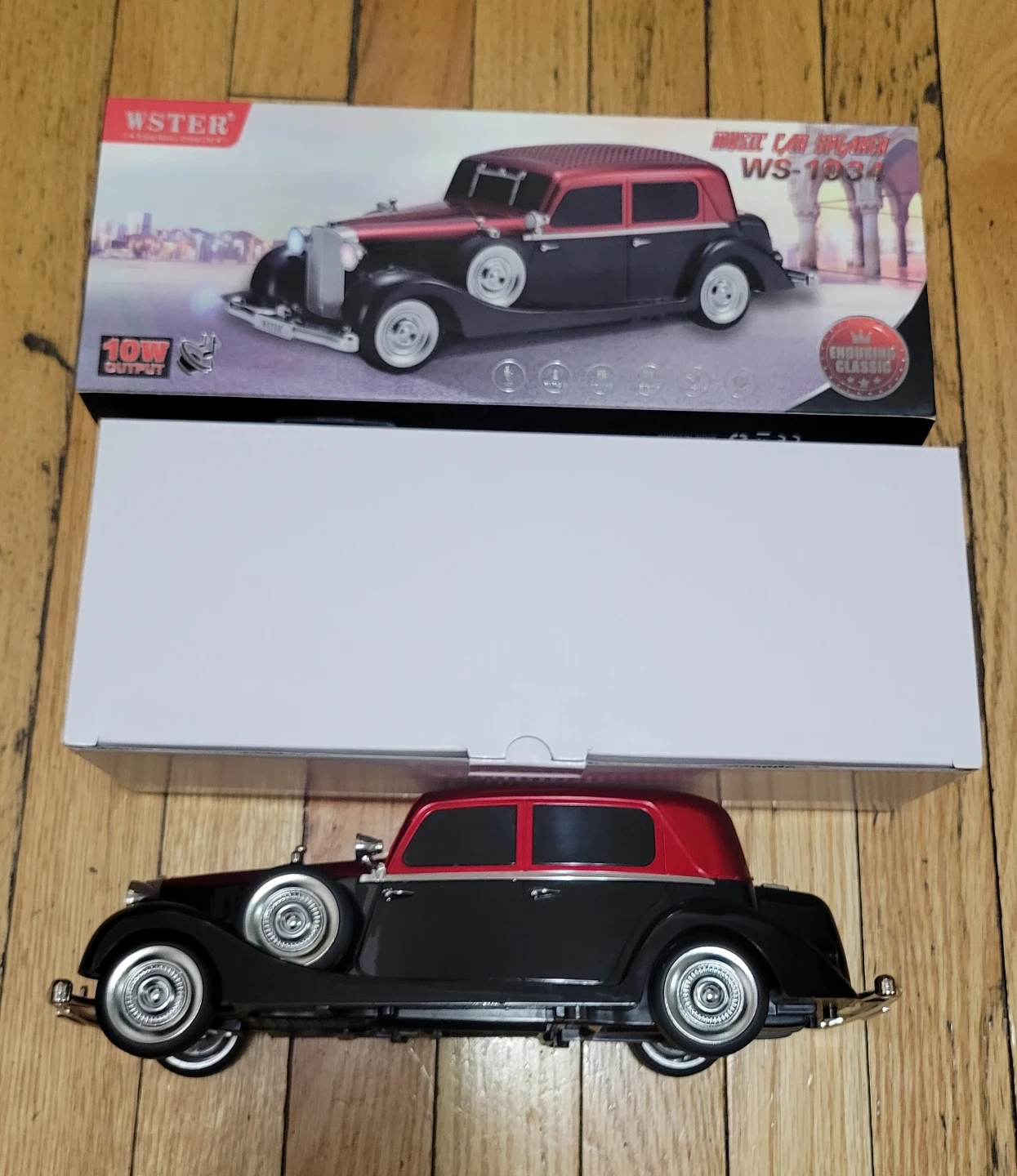 This is a WSTER WS-1934 music car speaker. It features a 10W output. The speaker is designed to look like a classic car.