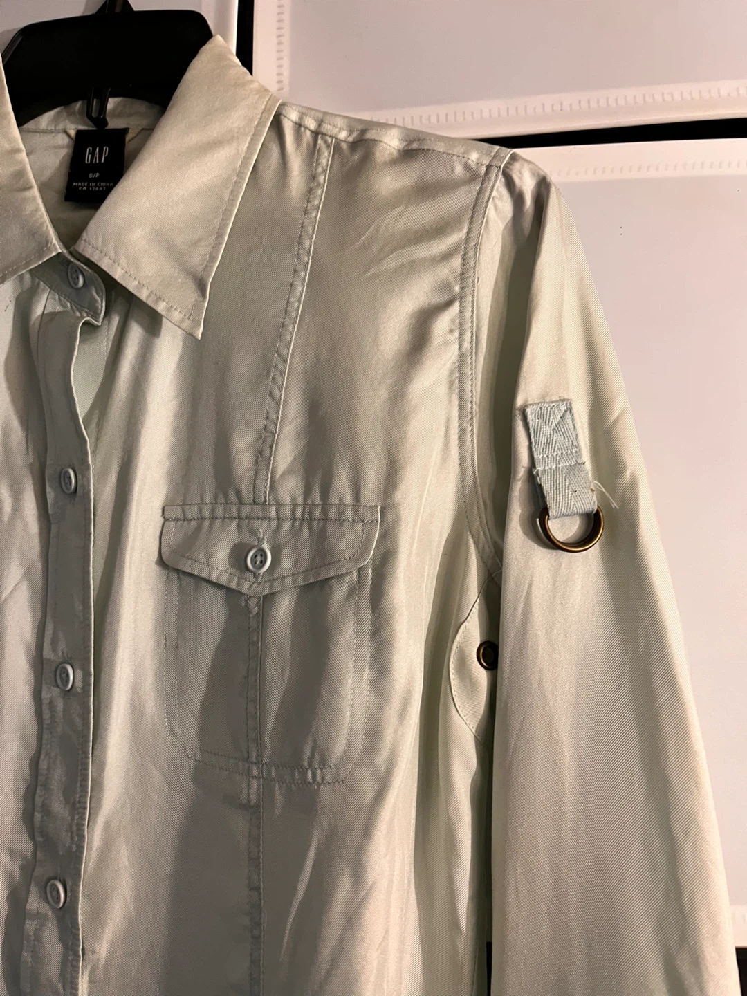 This is a women's long sleeve button-up shirt from GAP. It's made of 100% silk. The shirt features two chest pockets and a classic collar.