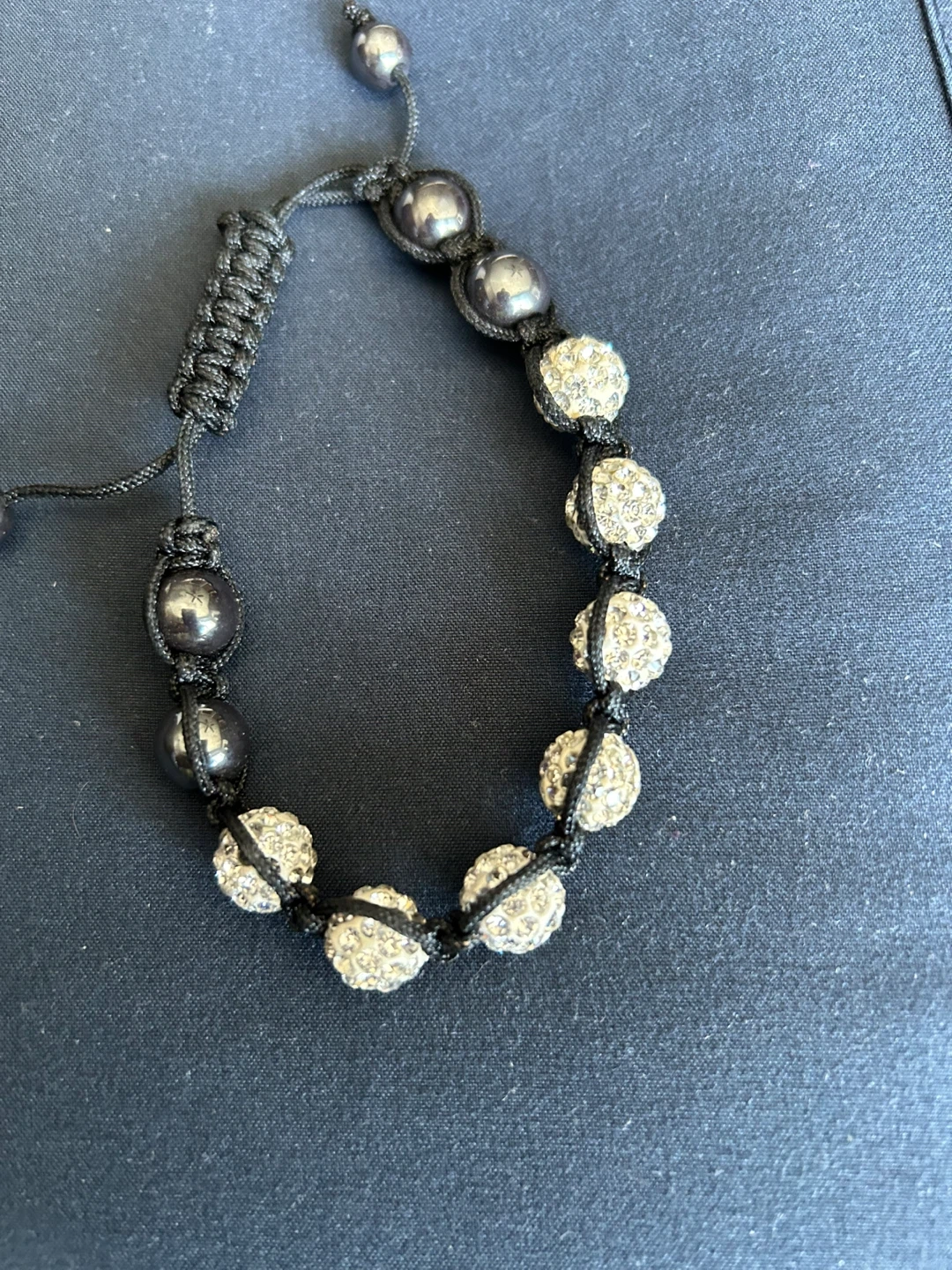 This bracelet features a black cord with adjustable closure. It has shiny, sparkly beads and dark grey pearls. It's a great accessory for adding a bit of bling!