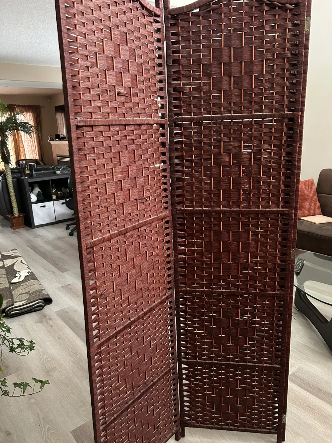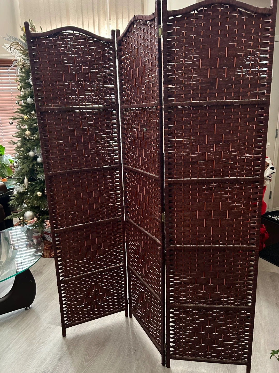 This is a 3-panel room divider with a woven texture. It's maroon and made of a woven material. It's useful for separating spaces in your home.
