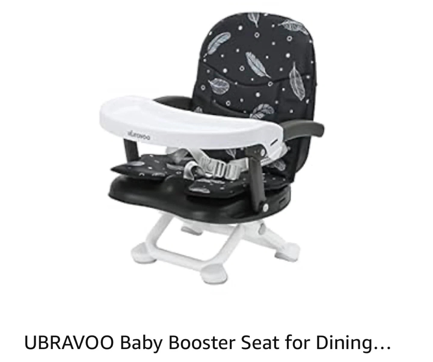 This UBRAVOO baby booster seat is designed for dining. It features a black seat with a feather pattern and includes a white tray and harness. It's a convenient seat for meal times.