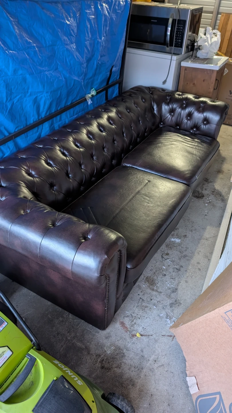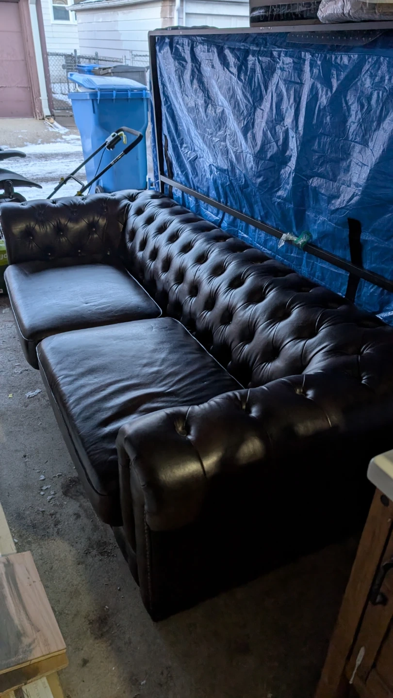 Dark brown tufted chesterfield sofa with chaise. Plush cushioning, genuine leather and classic design. This sofa seats three comfortably.