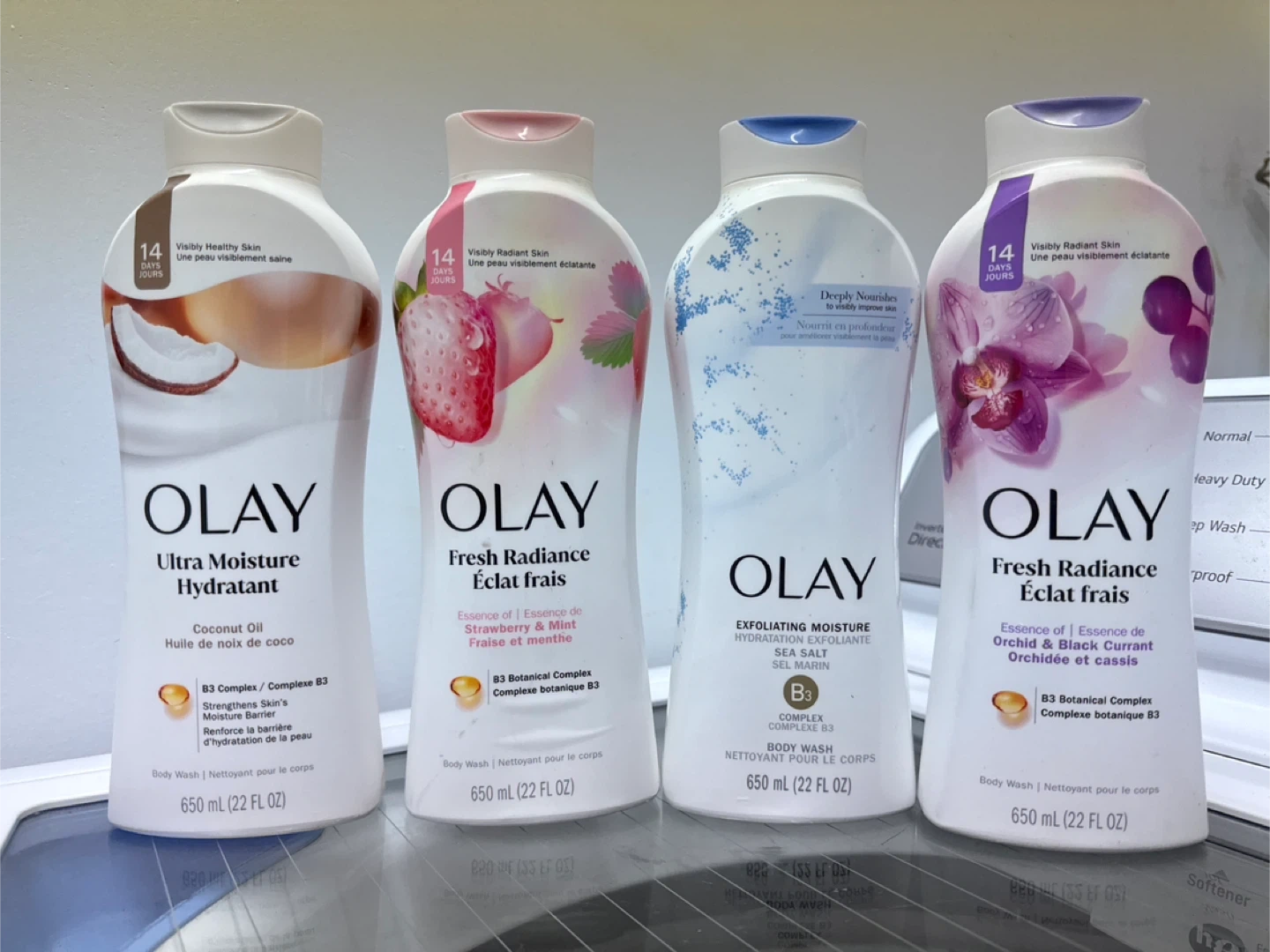 Selling a variety pack of Olay body washes! Each bottle contains 650 mL (22 FL OZ). You'll get: - Ultra Moisture Hydratant (Coconut Oil) - Fresh Radiance Éclat frais (Strawberry & Mint) - Exfoliating Moisture (Sea Salt) - Fresh Radiance Éclat frais (Orchid & Black Currant)