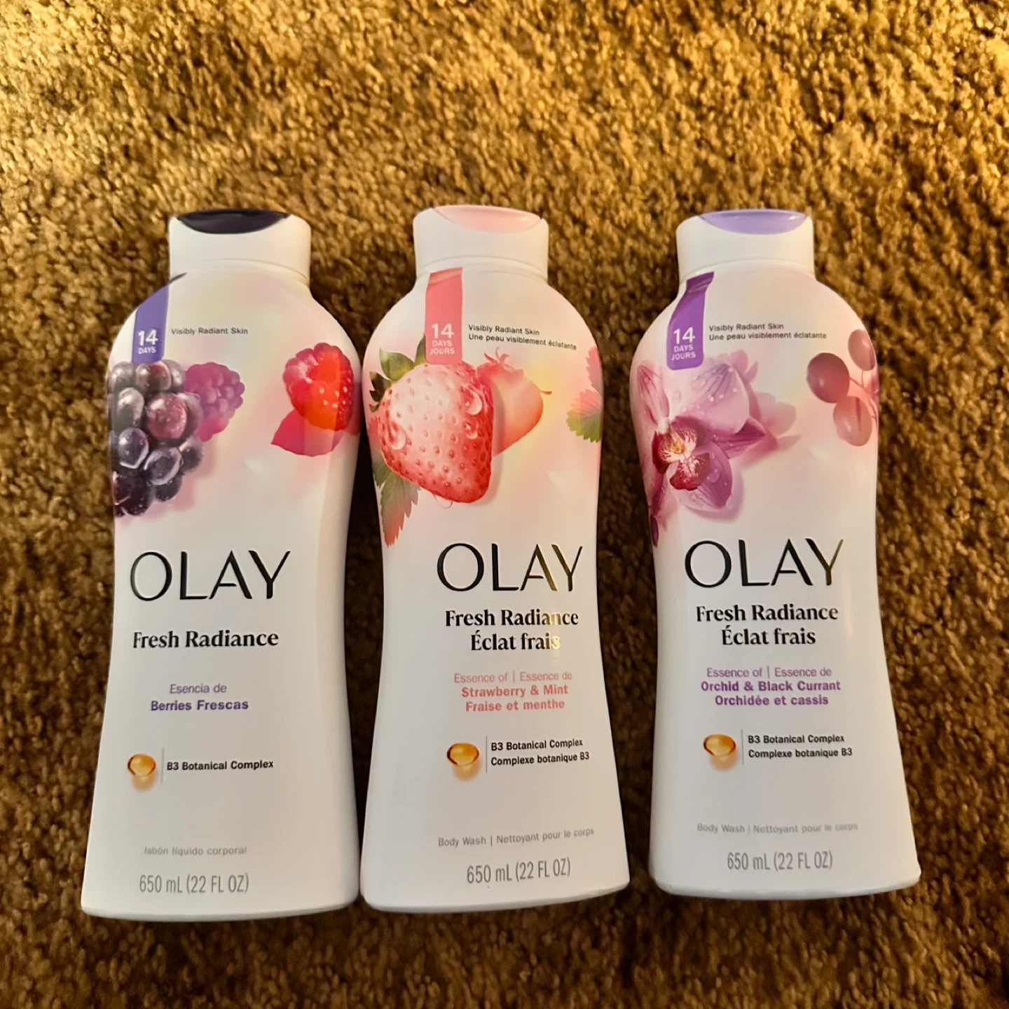 Selling three bottles of Olay Fresh Radiance body wash! Each bottle is 650 mL (22 fl oz). You'll get one each of: Berries Frescas, Strawberry & Mint, and Orchid & Black Currant. They each contain B3 Botanical Complex.