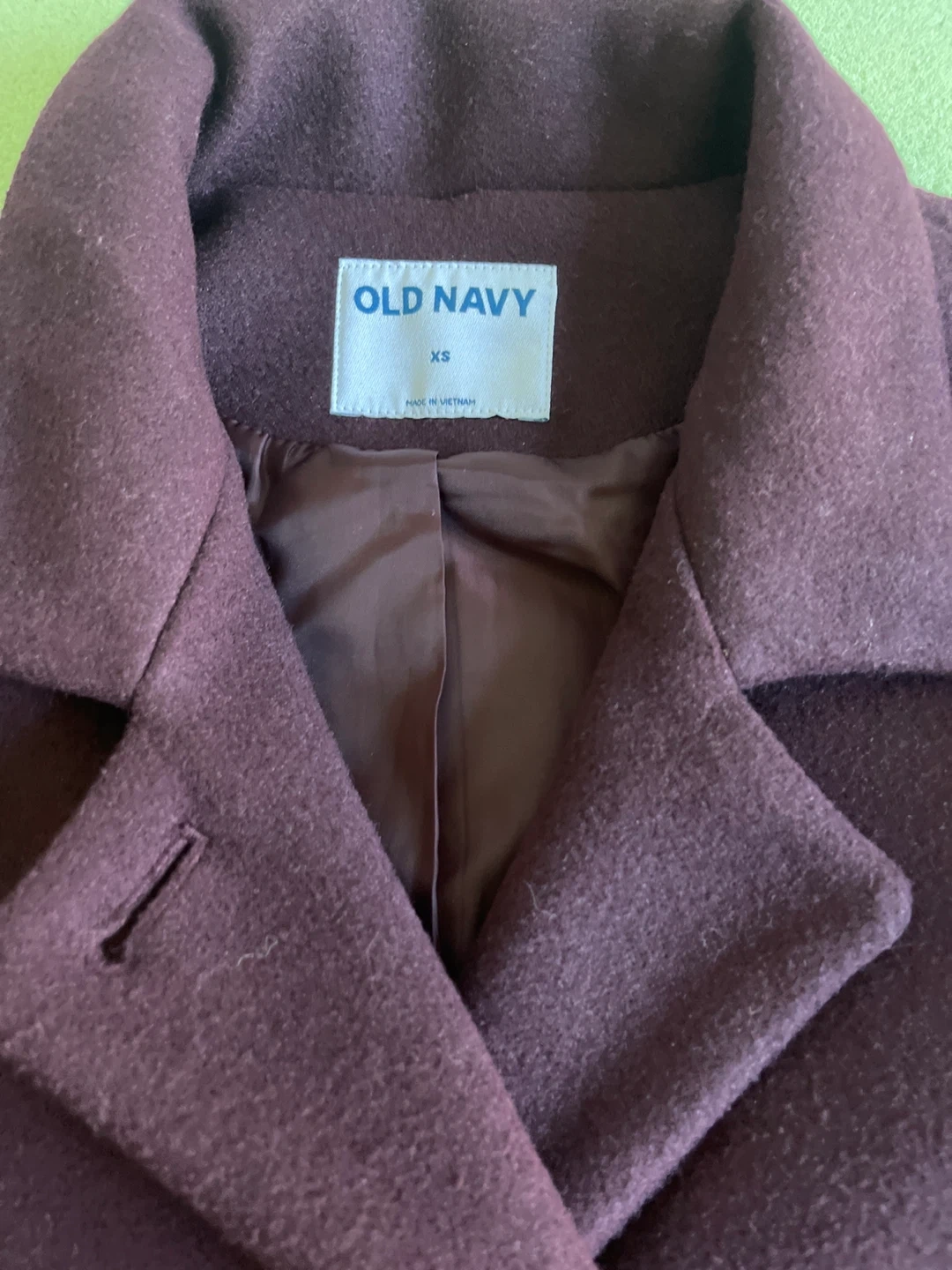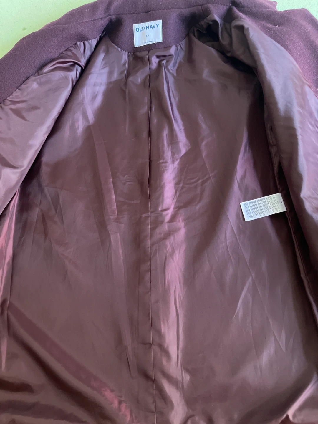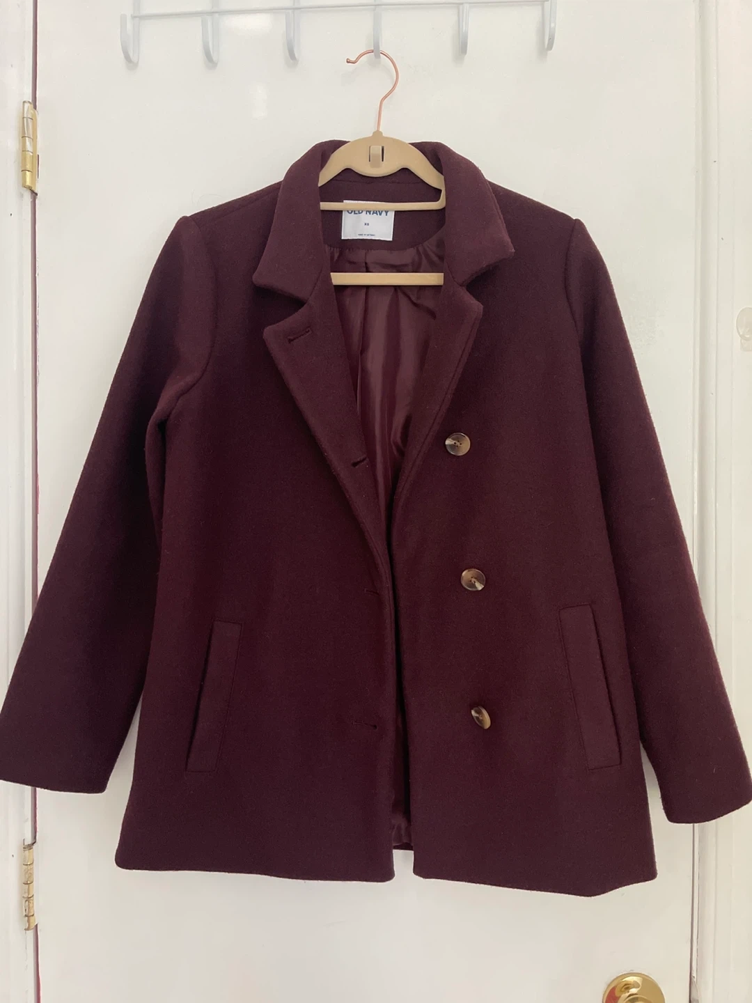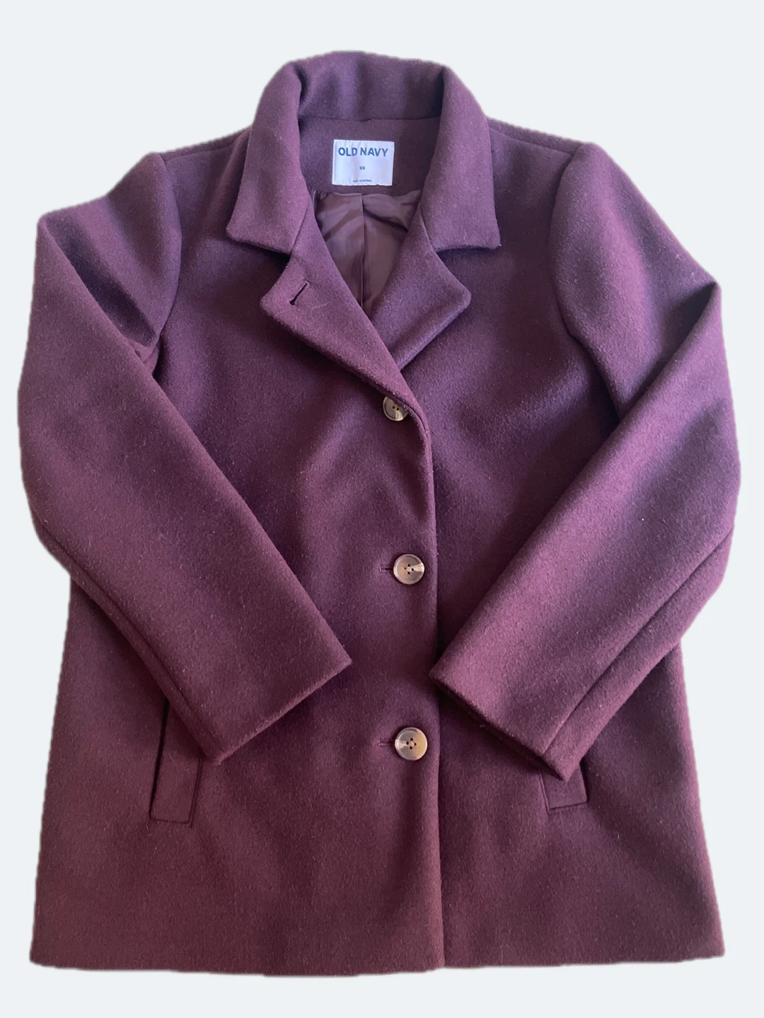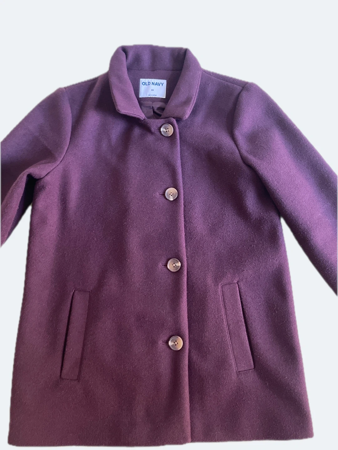 Selling a cute Old Navy coat in size XS! It's a lovely plum color and has a classic design with buttons and pockets