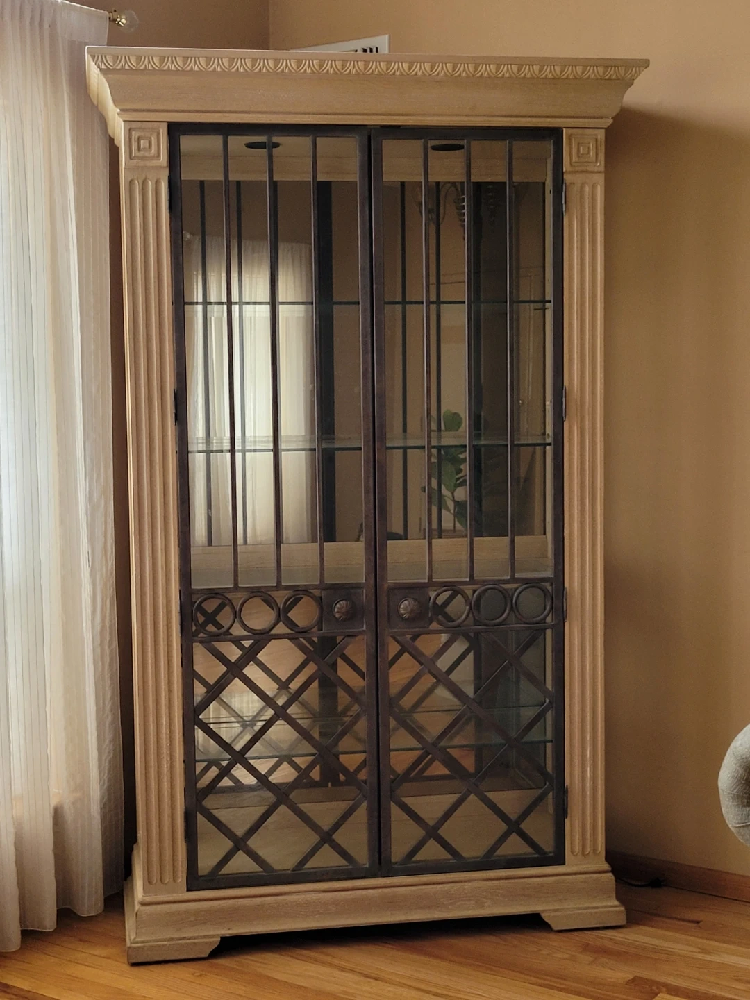 A tall display cabinet featuring glass doors with decorative metal accents. The cabinet has multiple shelves for storage and display. It's a lovely piece for showcasing collectibles or dining room essentials!