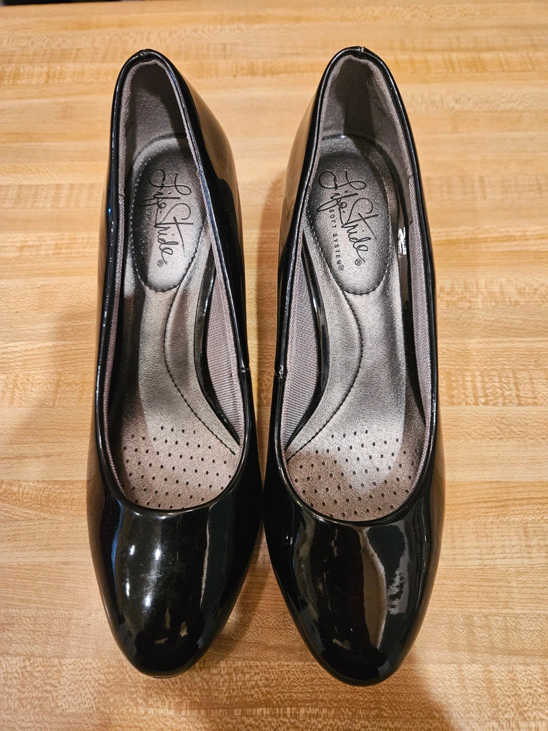 Black patent leather heels from Life Stride. Features Soft System comfort technology. Heel height appears to be about 2 inches. Size 7.