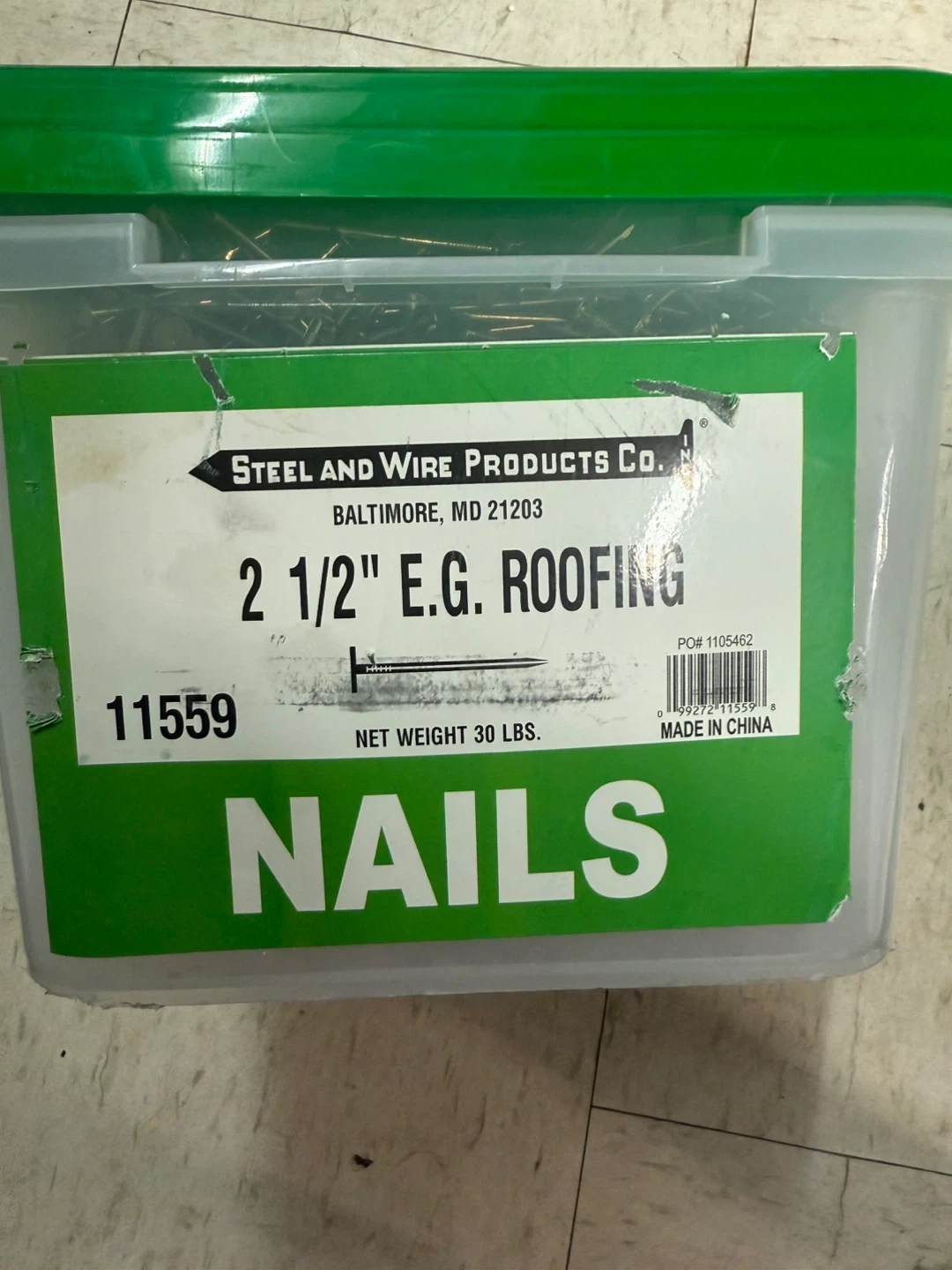 Selling a container of 2 1/2" E.G. roofing nails from Steel and Wire Products Co. The container has a net weight of 30 lbs