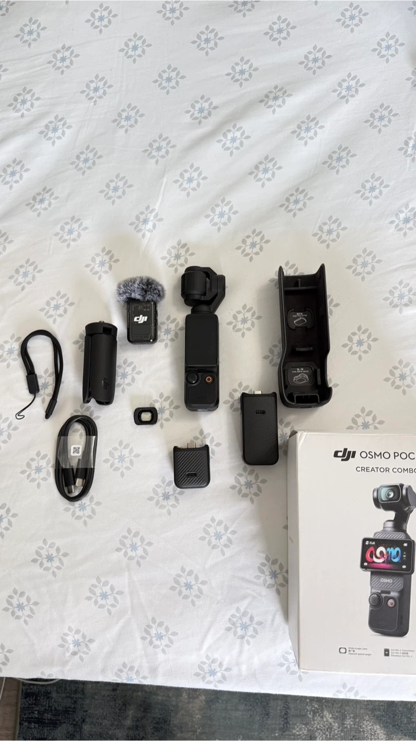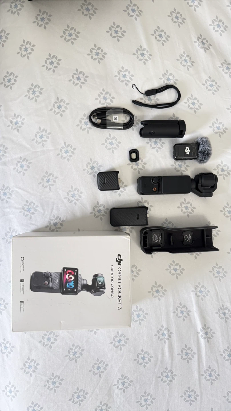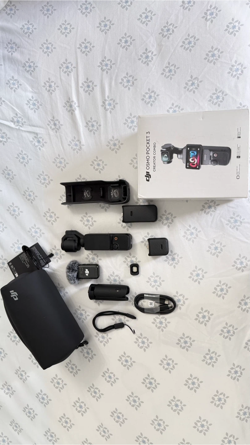 This DJI Osmo Pocket 3 Creator Combo includes the action camera, a microphone, charging accessories, and a carrying case. It's designed for capturing high-quality video content on the go. The kit contains everything needed to start filming immediately.
