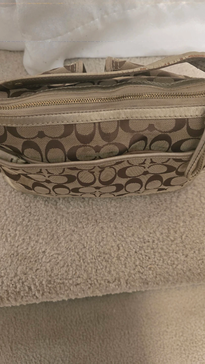 Selling a Coach Signature Hobo Bag in good condition! It features the classic Coach logo pattern with gold detailing. This bag is perfect for everyday use and has a stylish, compact design. It's a great addition to any wardrobe!