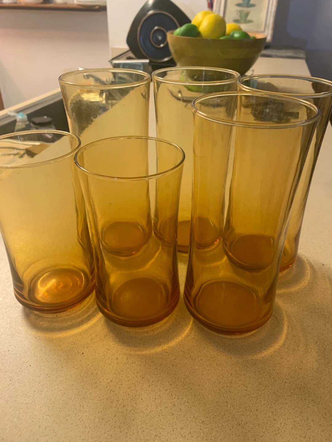 Selling a set of six vintage amber-colored glass tumblers. These glasses have a lovely warm tone and a classic design. They're perfect for everyday use or for adding a touch of retro charm to your table setting!