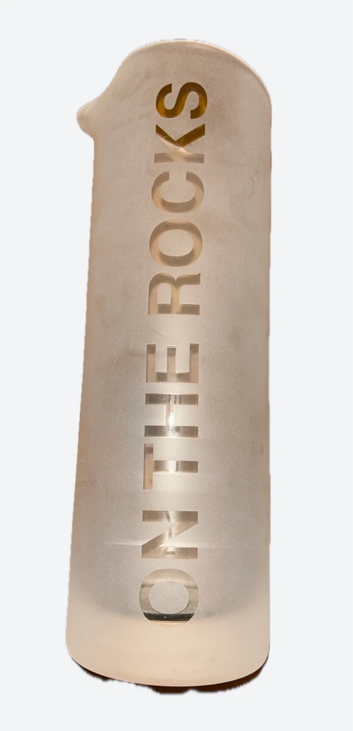 1000+Selling a glass cocktail pitcher with 'On The Rocks' etched on the side. Perfect for your next cocktail party. 9 inch tall. New condition.