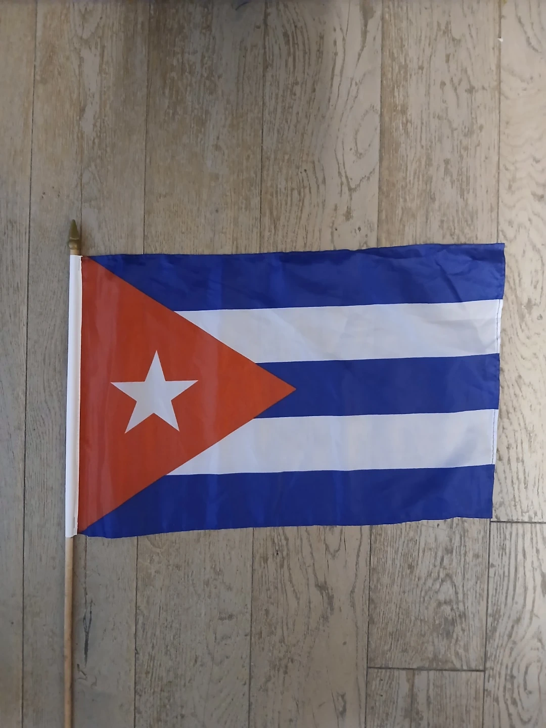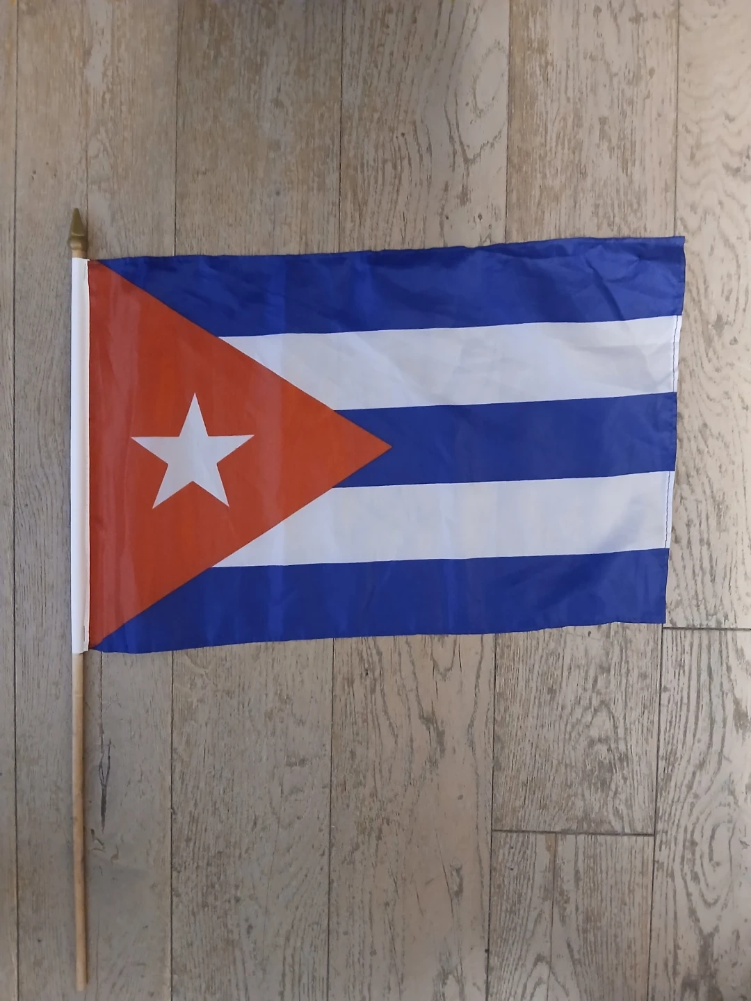This is a Cuban flag with a wooden stick. It's made of fabric and features the distinctive red triangle with a white star, along with blue and white stripes. The dimensions of the flag itself are approximately 12 inches by 18 inches. It's suitable for display or waving.