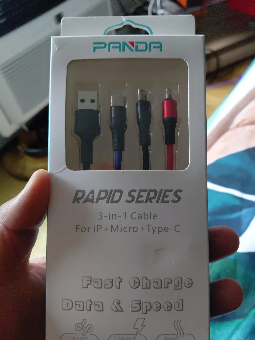 This Panda Rapid Series cable offers 3-in-1 connectivity for iP, Micro, and Type-C devices. It's designed for fast charging and data transfer. Includes original packaging.