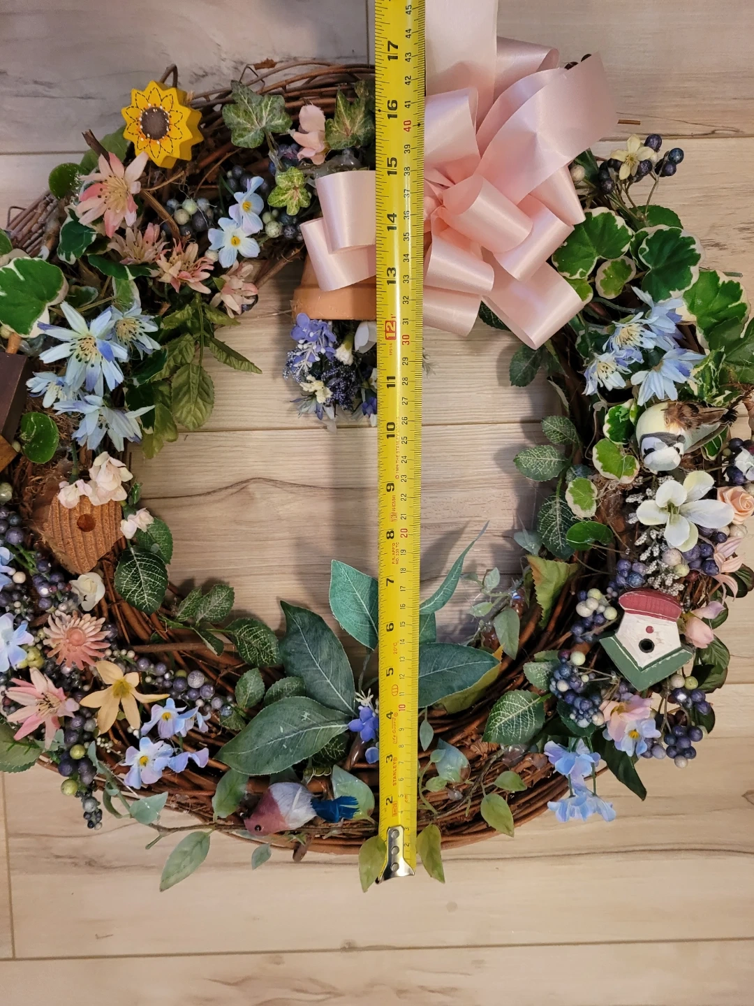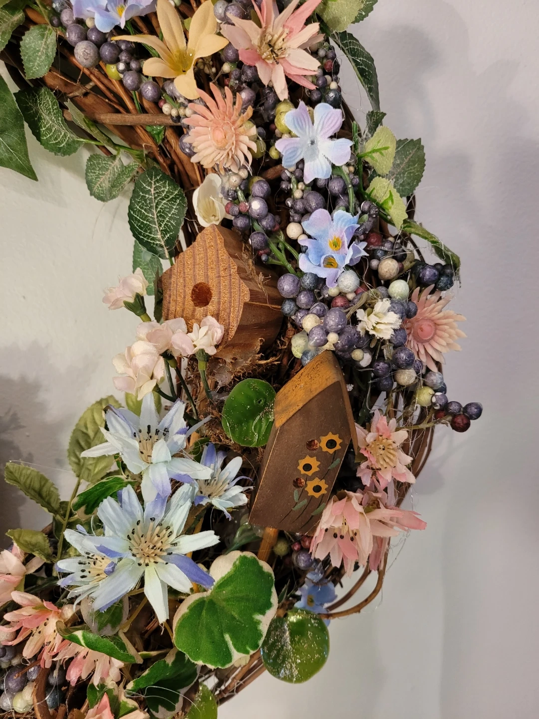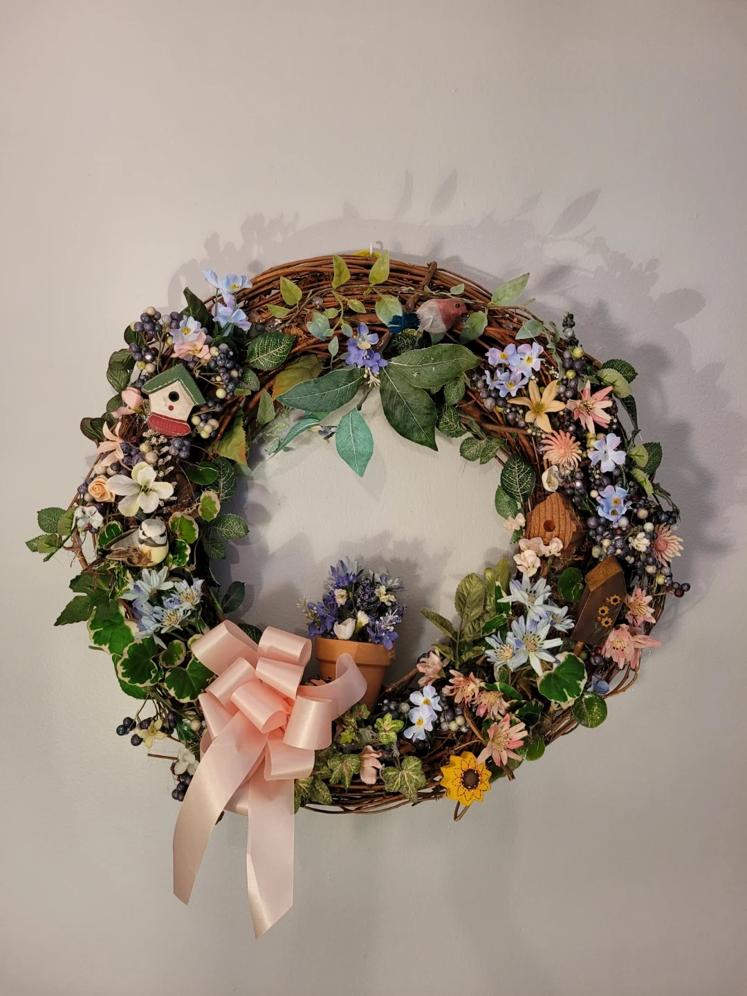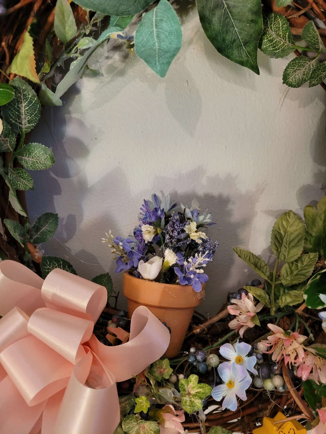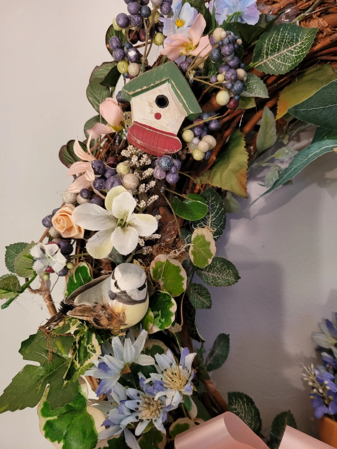 Handcrafted decorative spring wreath featuring an assortment of artificial flowers, berries, greenery, and small decorative birdhouses. It also includes a small faux potted plant and a pastel pink ribbon bow. Adds a cheerful touch to any door or wall! Does show glue gun glue and strands see close up photos.