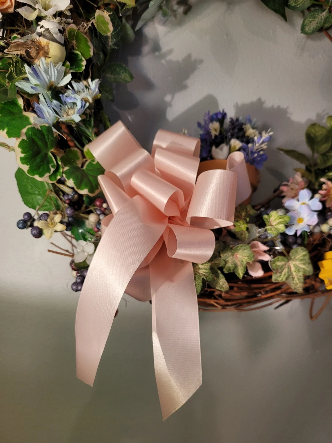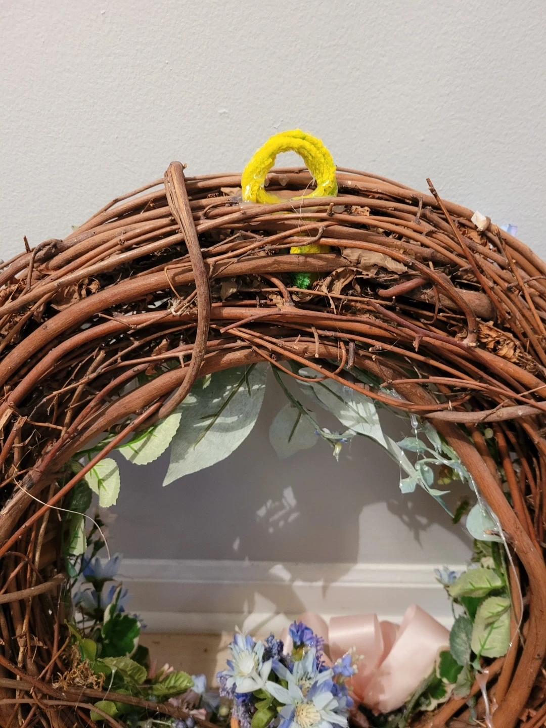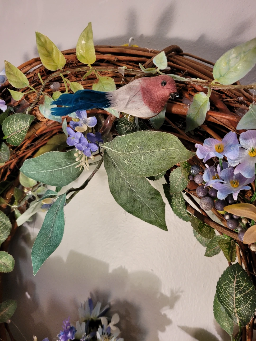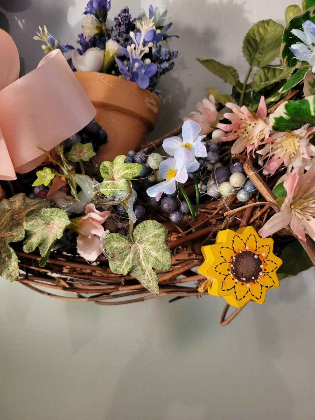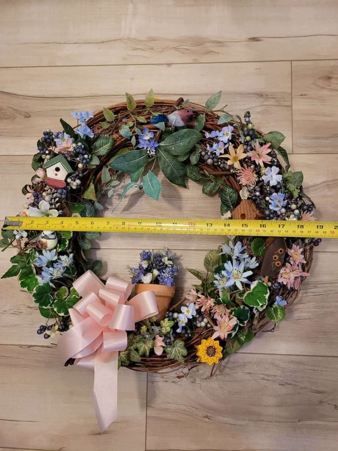Handcrafted decorative spring wreath featuring an assortment of artificial flowers, berries, greenery, and small decorative birdhouses. It also includes a small faux potted plant and a pastel pink ribbon bow. Adds a cheerful touch to any door or wall! Does show glue gun glue and strands see close up photos.