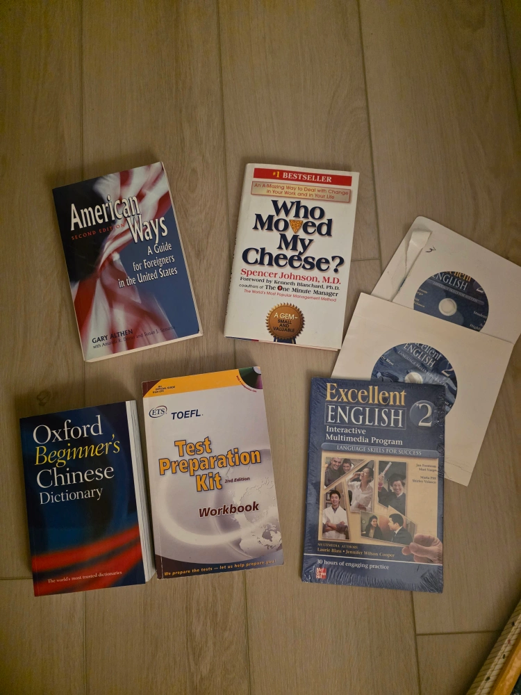 Textbook bundle includes American Ways, Who Moved My Cheese?, Oxford Beginner's Chinese Dictionary, TOEFL test prep kit, and Excellent English 2 interactive multimedia program. Great for language learners.