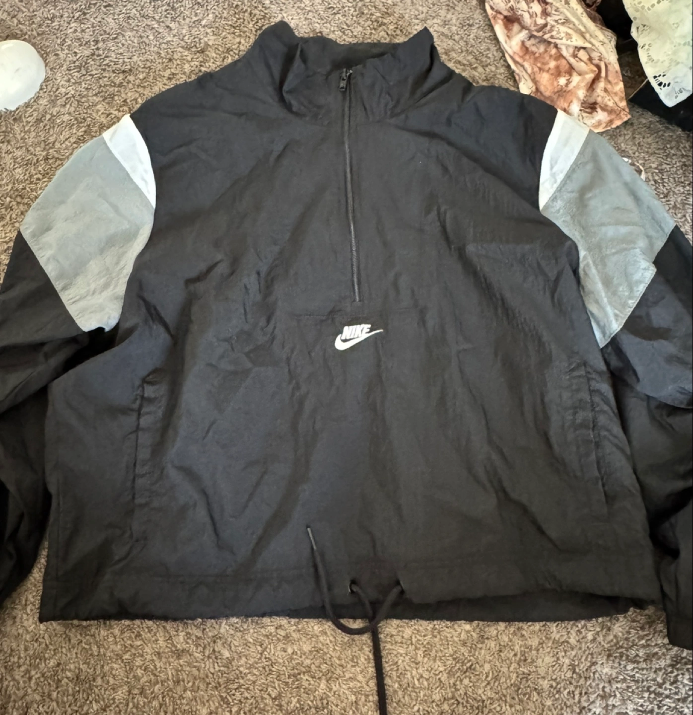 Selling a Nike pullover jacket in black with gray and white accents on the sleeves. It has a quarter-zip closure and a drawstring at the bottom. Perfect for layering! Size medium