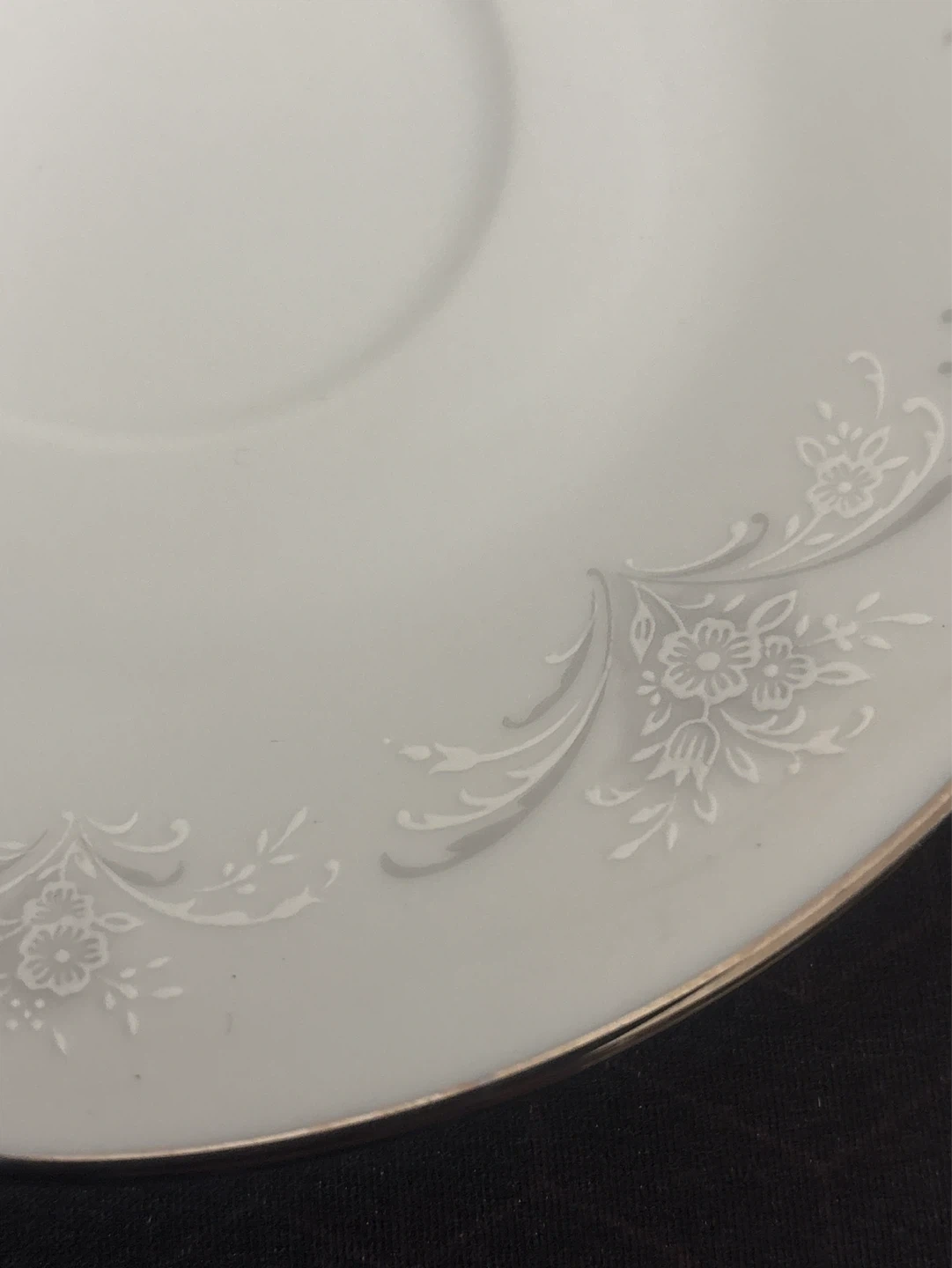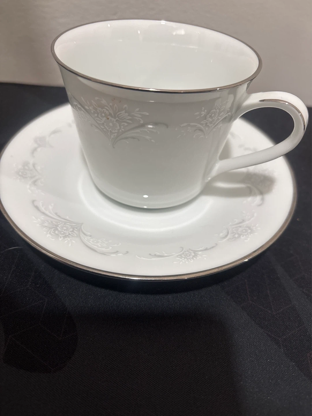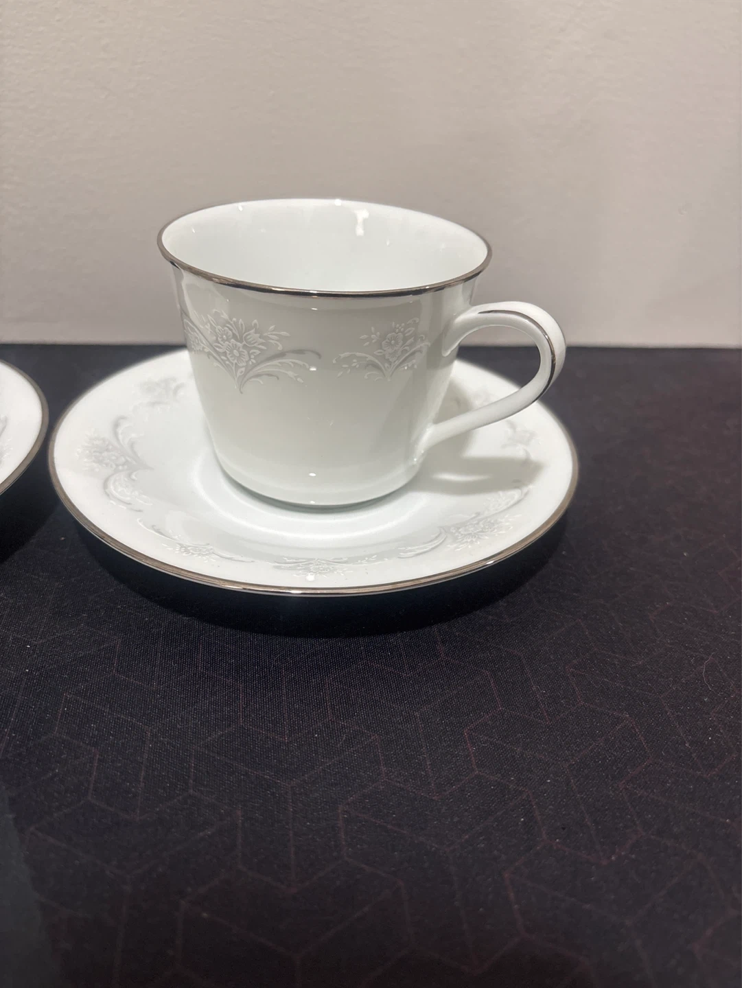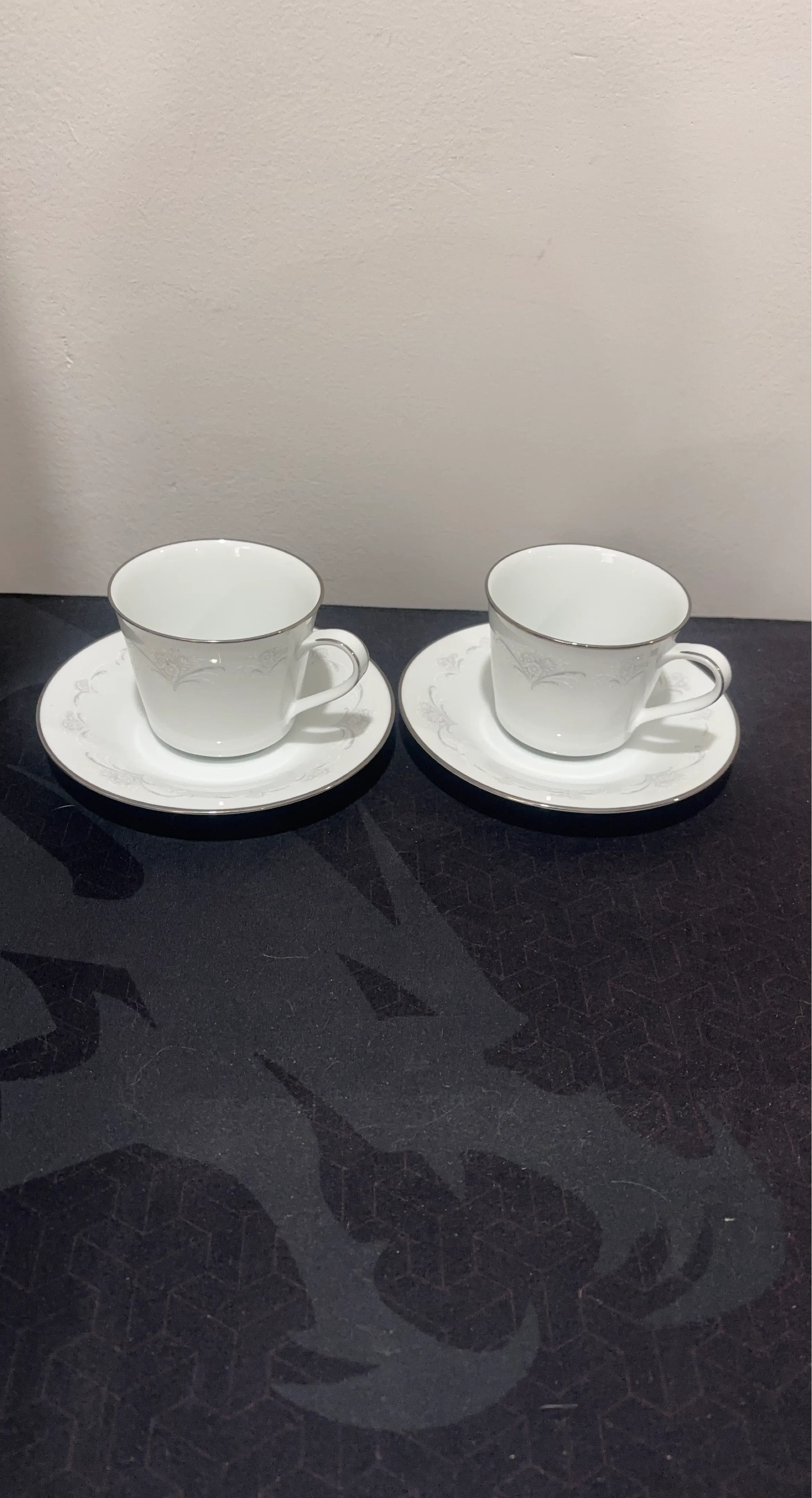 This is a set of two fine China Noritake Casablanca teacups with saucers. Each piece is made of white porcelain with a delicate floral pattern and silver trim. They're perfect for enjoying your favorite hot beverage.