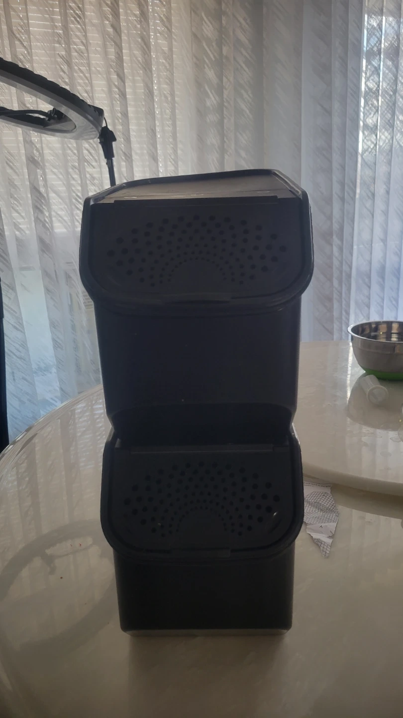 This is a two-tiered black compost bin. It's made of plastic with a lid on each tier featuring ventilation holes. Great for composting kitchen scraps indoors!