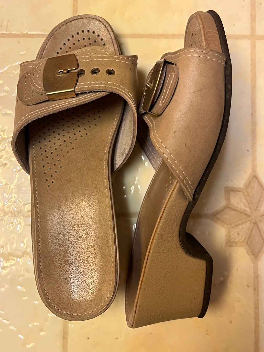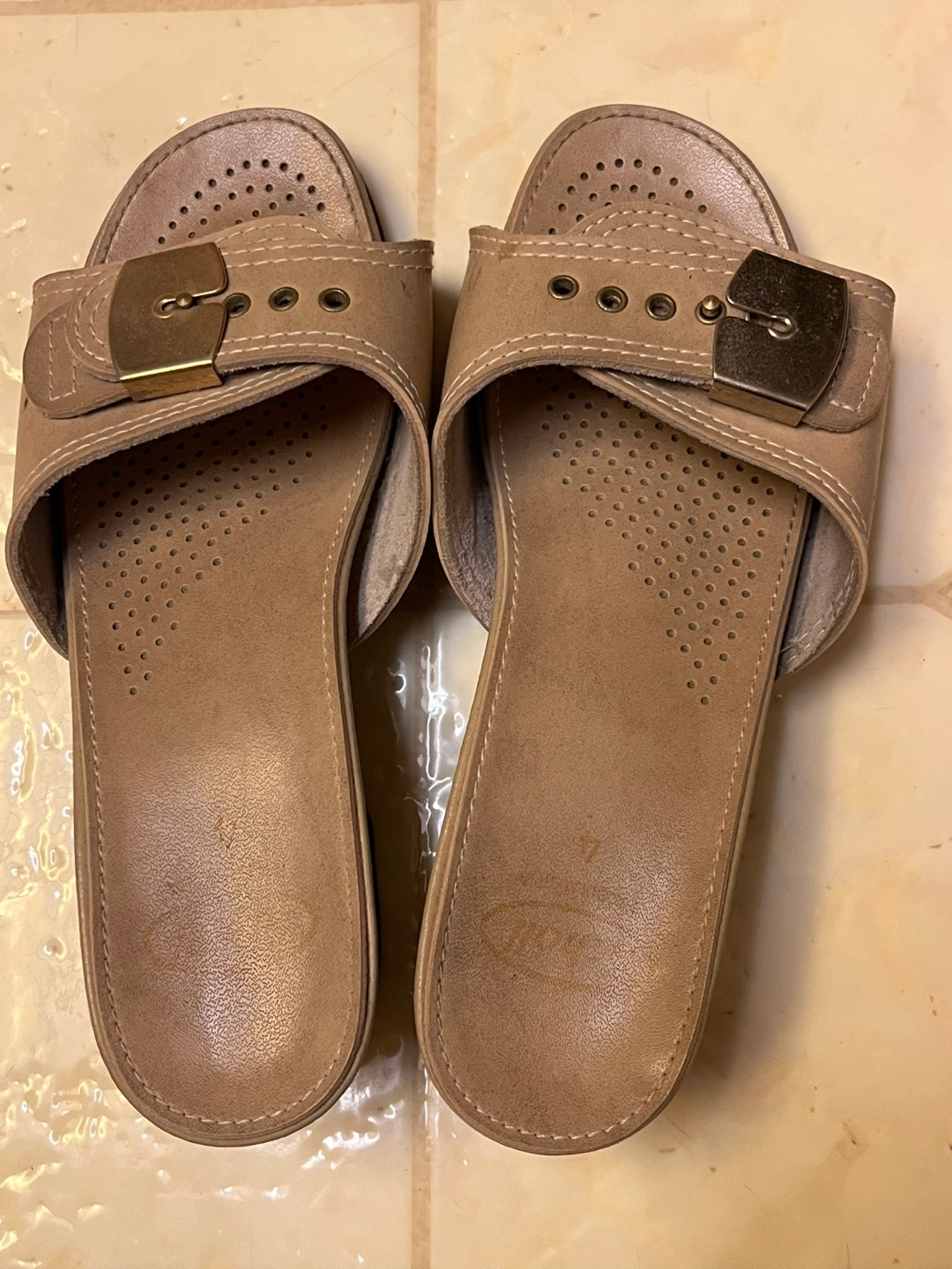 Scholl classic sandals with a buckle and a small heel. The tan slip-on sandals feature a contoured comfort footbed.