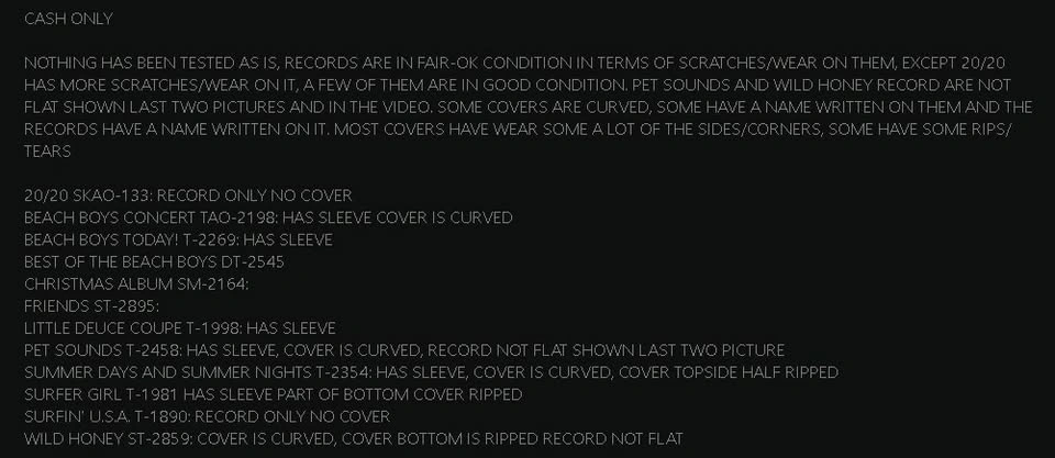 NOTHING HAS BEEN TESTED AS IS, RECORDS ARE IN FAIR-OK CONDITION IN TERMS OF SCRATCHES/WEAR ON THEM, EXCEPT 20/20 HAS MORE SCRATCHES/WEAR ON IT, A FEW OF THEM ARE IN GOOD CONDITION. PET SOUNDS AND WILD HONEY RECORD ARE NOT FLAT SHOWN LAST PICTURE. SOME COVERS ARE CURVED, SOME HAVE A NAME WRITTEN ON THEM AND THE RECORDS HAVE A NAME WRITTEN ON IT. MOST COVERS HAVE WEAR SOME A LOT OF THE SIDES/CORNERS, SOME HAVE SOME RIPS/TEARS