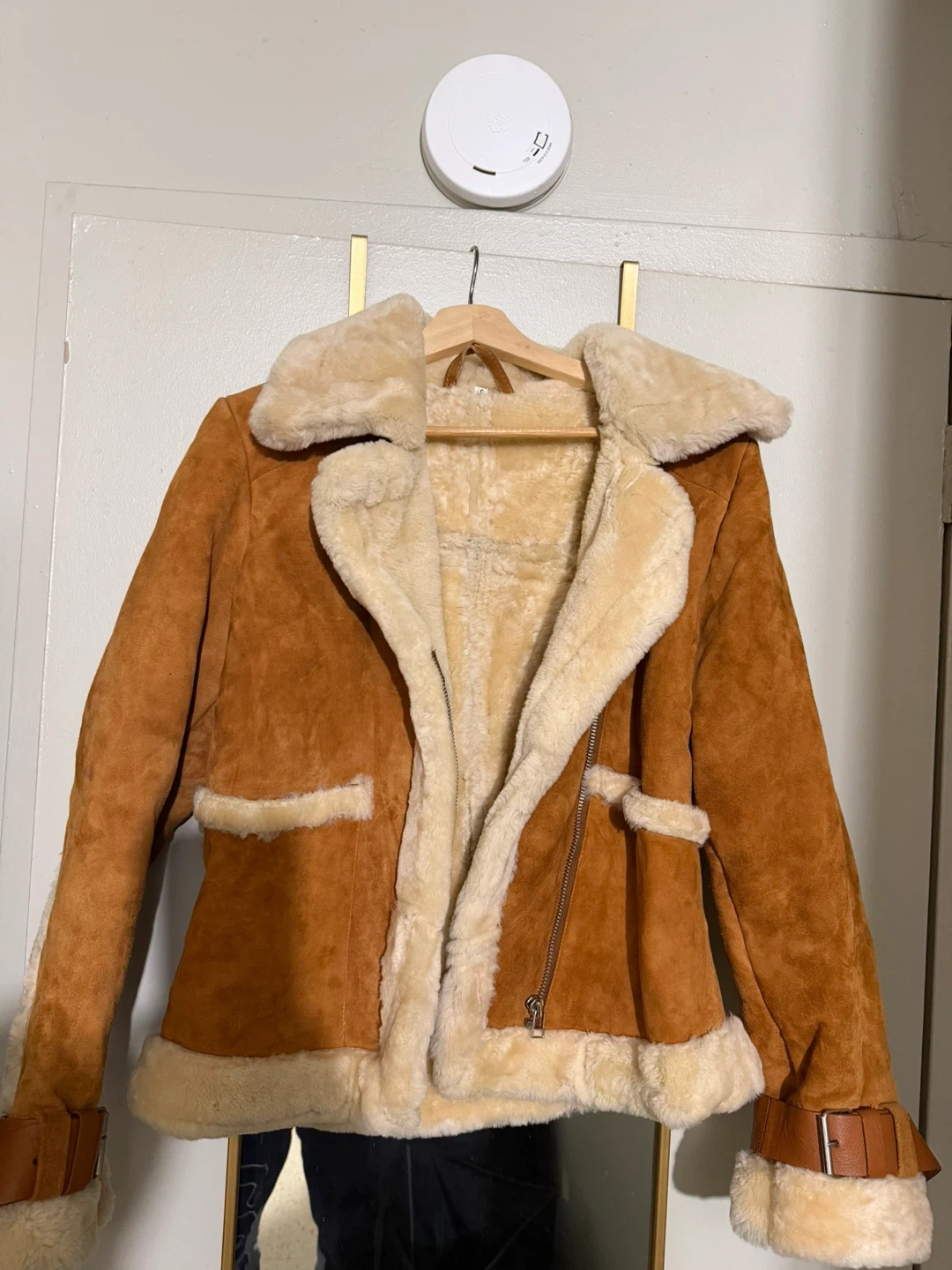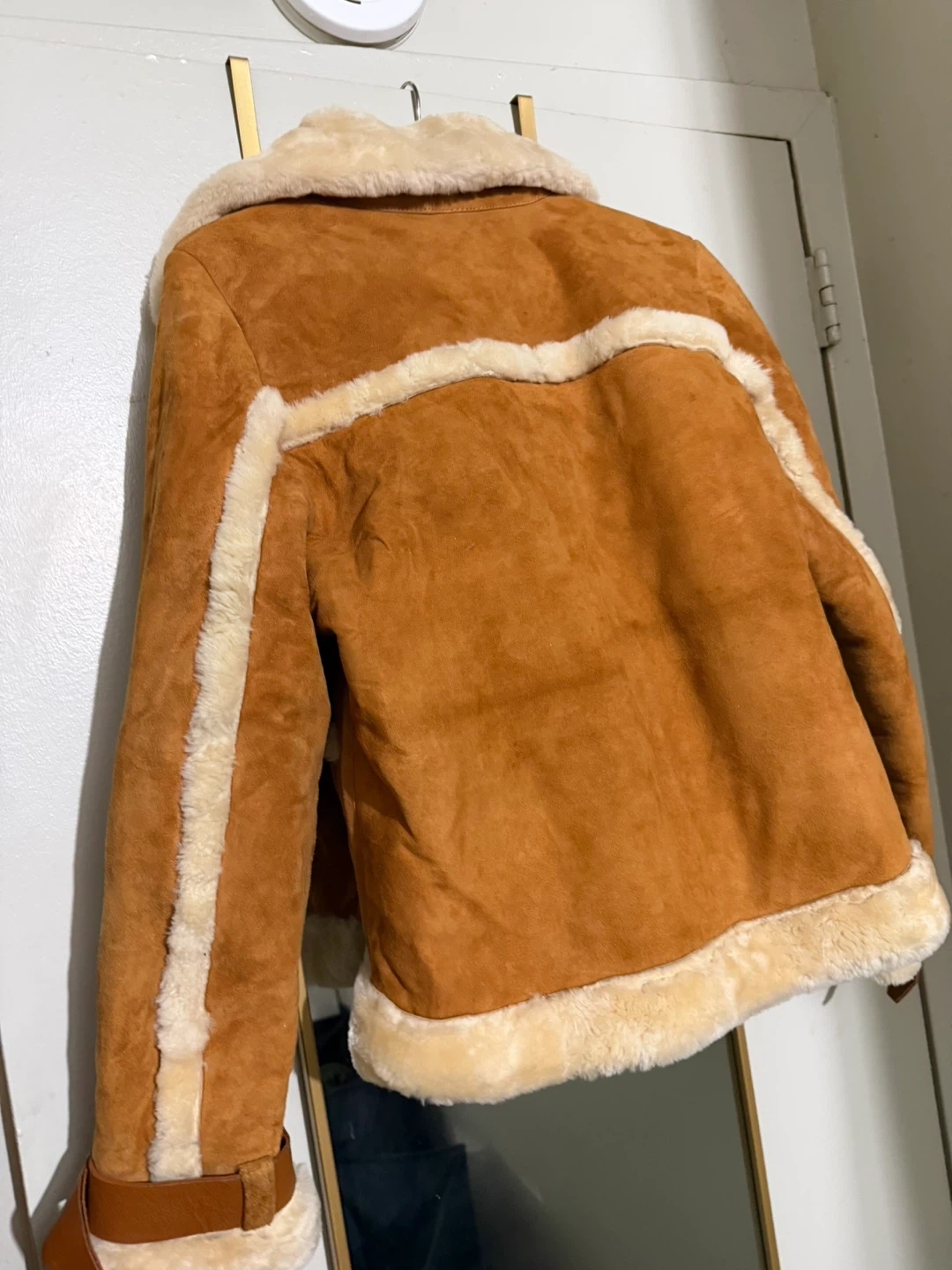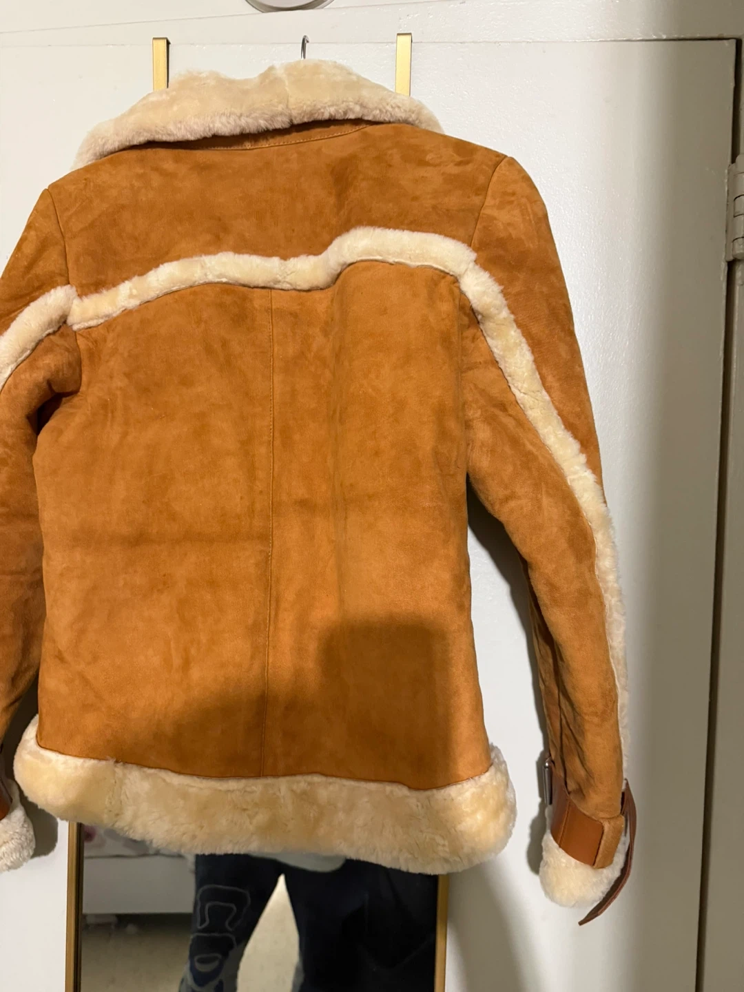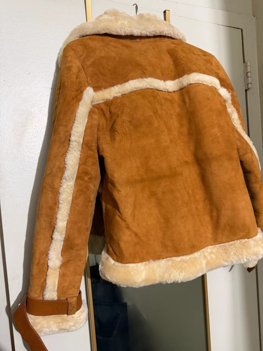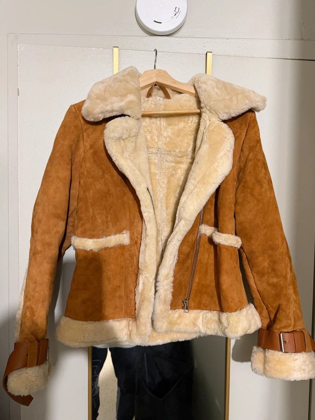 Selling a stylish brown suede jacket with shearling trim! It's a unique piece that adds a touch of vintage flair to any outfit. The jacket features shearling around the collar, cuffs, and hem, giving it a cozy and fashionable look. Perfect for layering during the colder months!