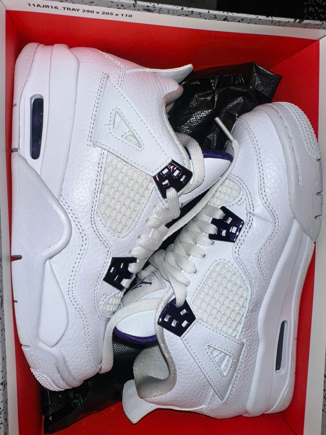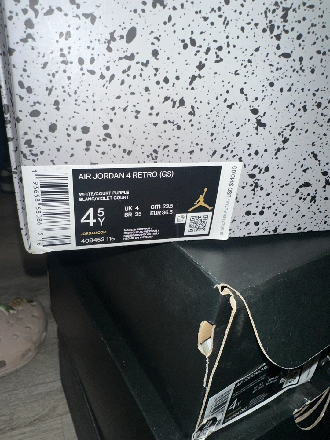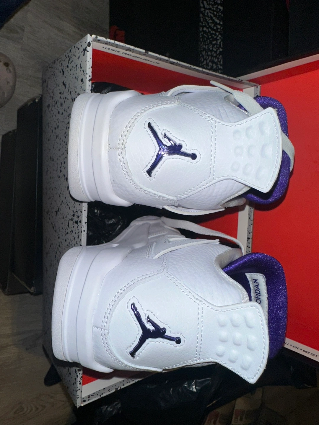 White leather and mesh Jordans with purple accents.. Includes original box.