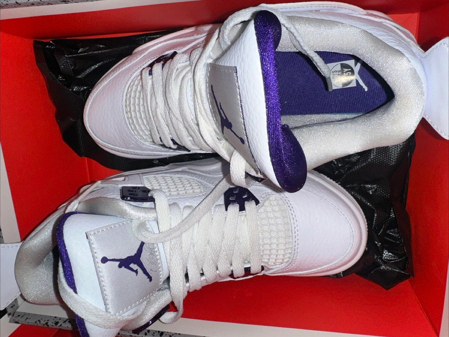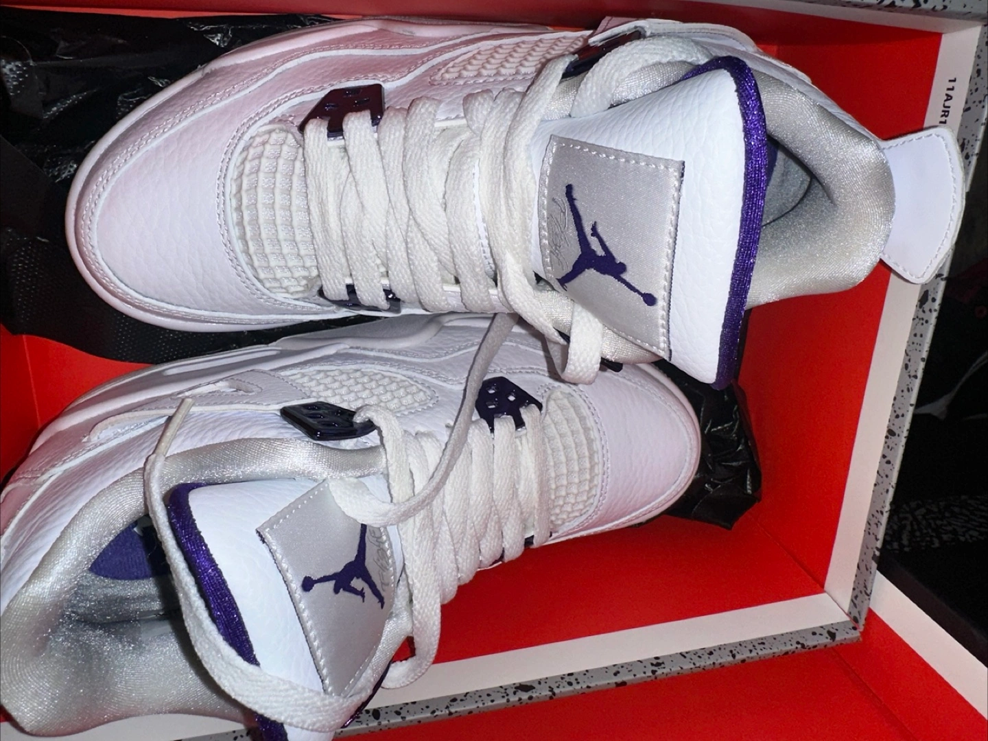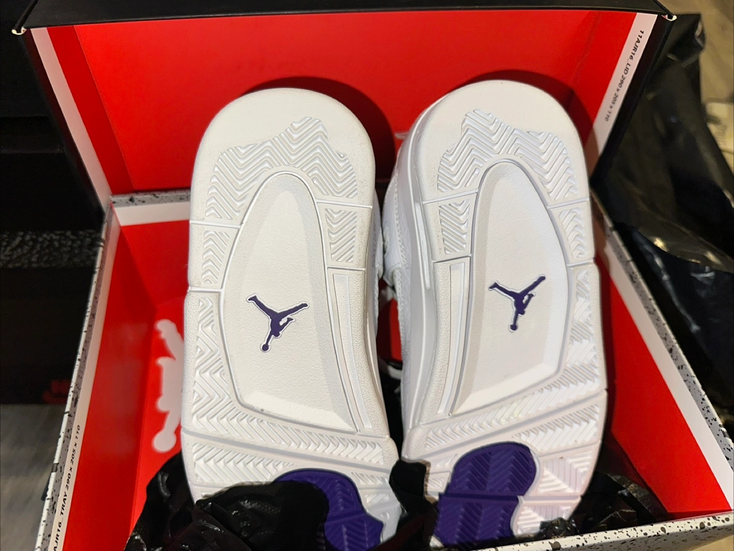 White leather and mesh Jordans with purple accents.. Includes original box.
