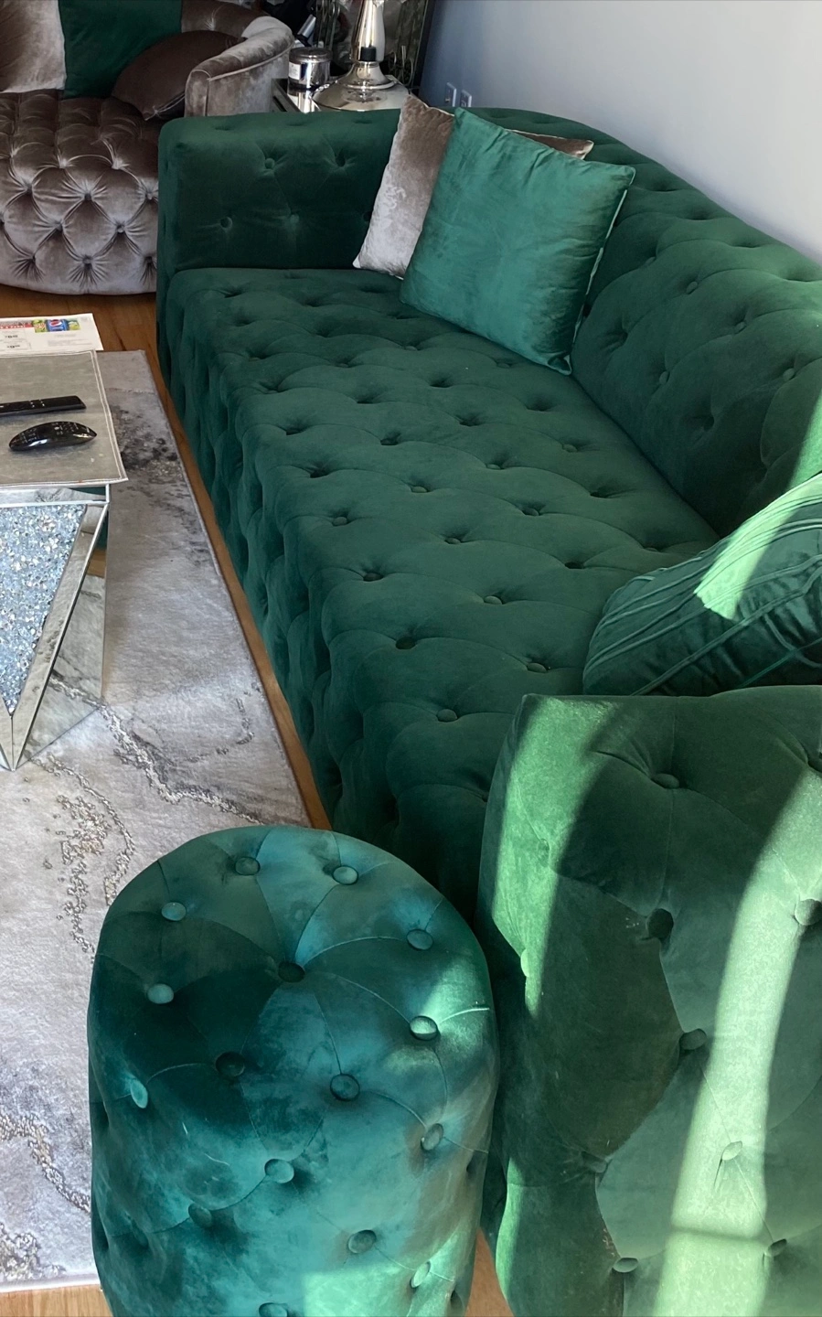 A luxurious deep green velvet sofa with tufted detailing, perfect for adding elegance to your living space. It includes a coordinating ottoman. Plush velvet upholstery offers a soft and inviting feel.