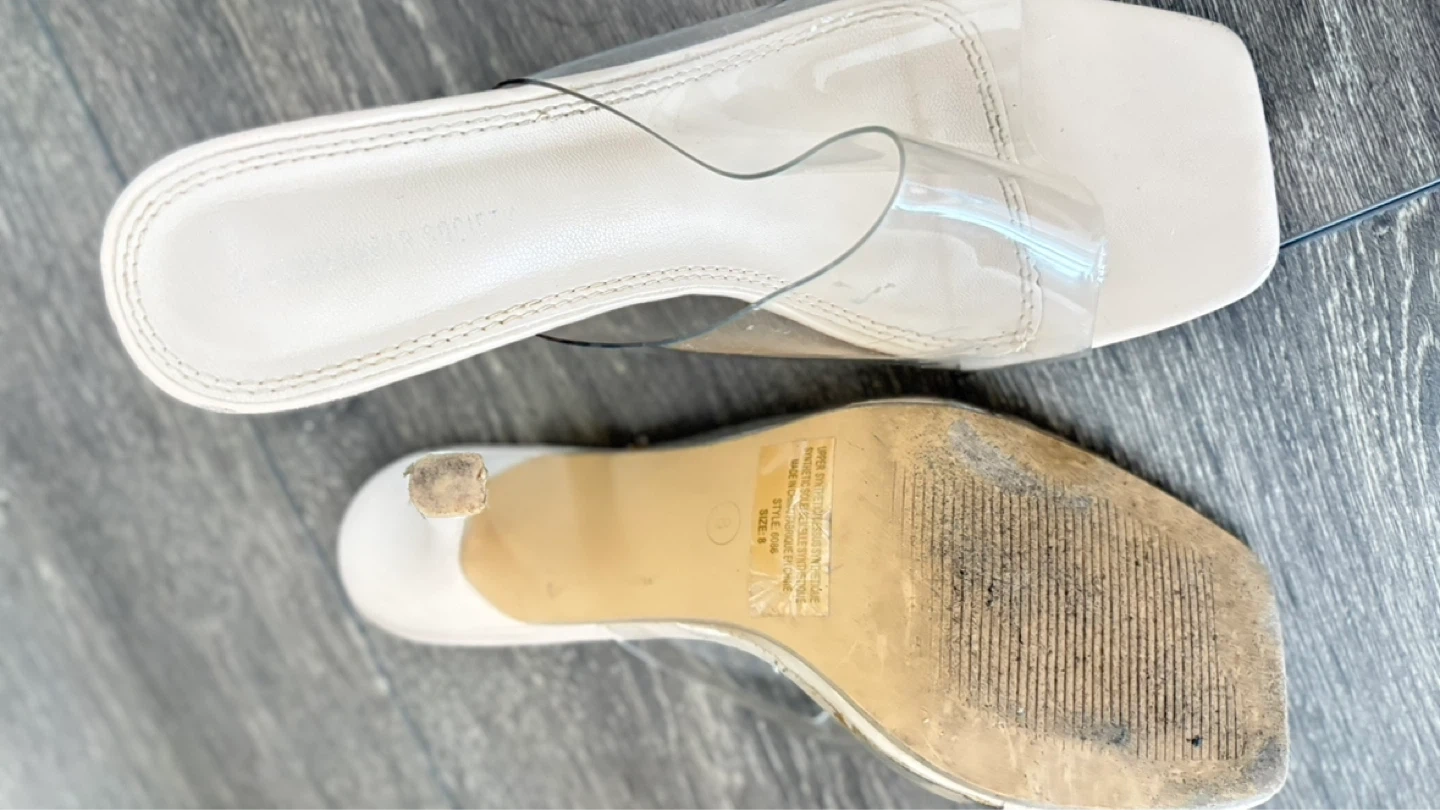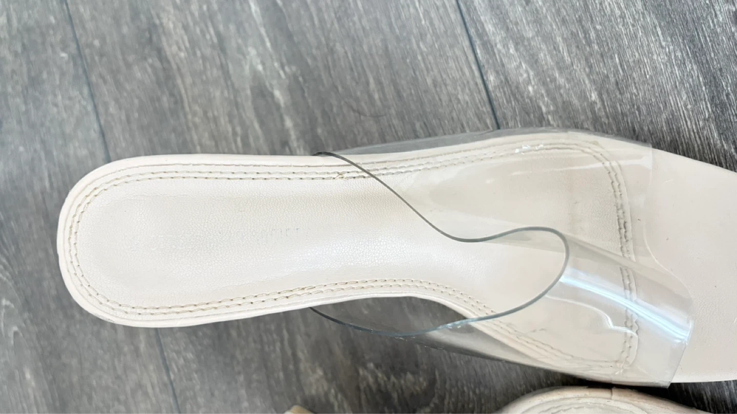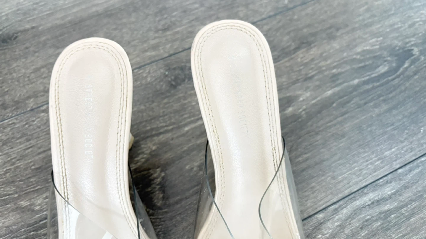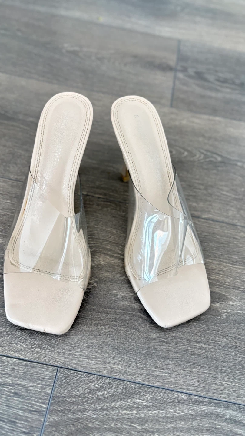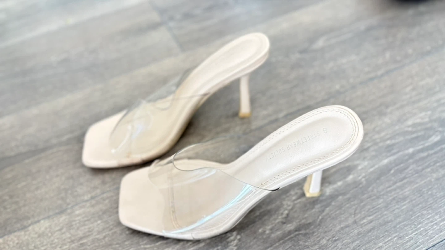 These clear strap heeled mules are from Streetwear Society. They feature a square toe and a beige faux leather footbed. Heel height appears to be approximately 3 inches.