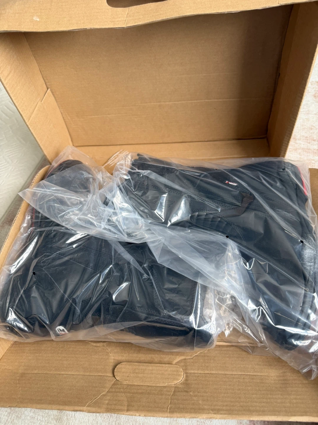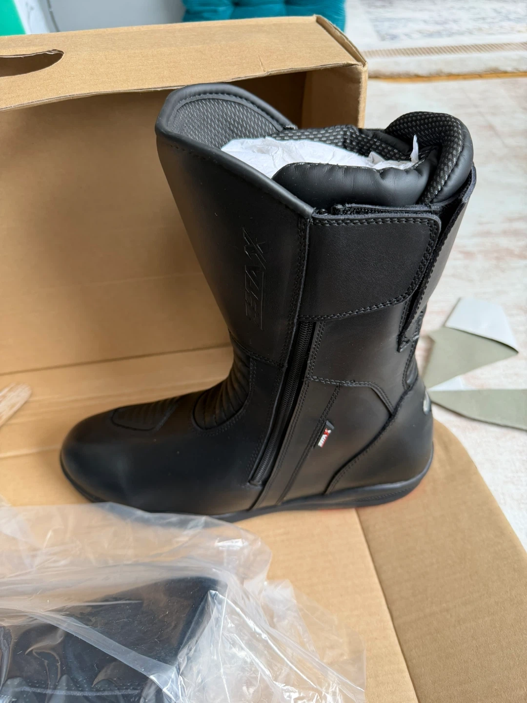Black leather motorcycle boots, includes original box and packaging. Zipper closure with velcro strap. These boots offer protection for riding.
