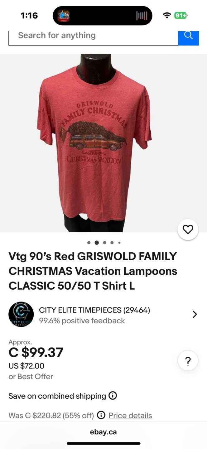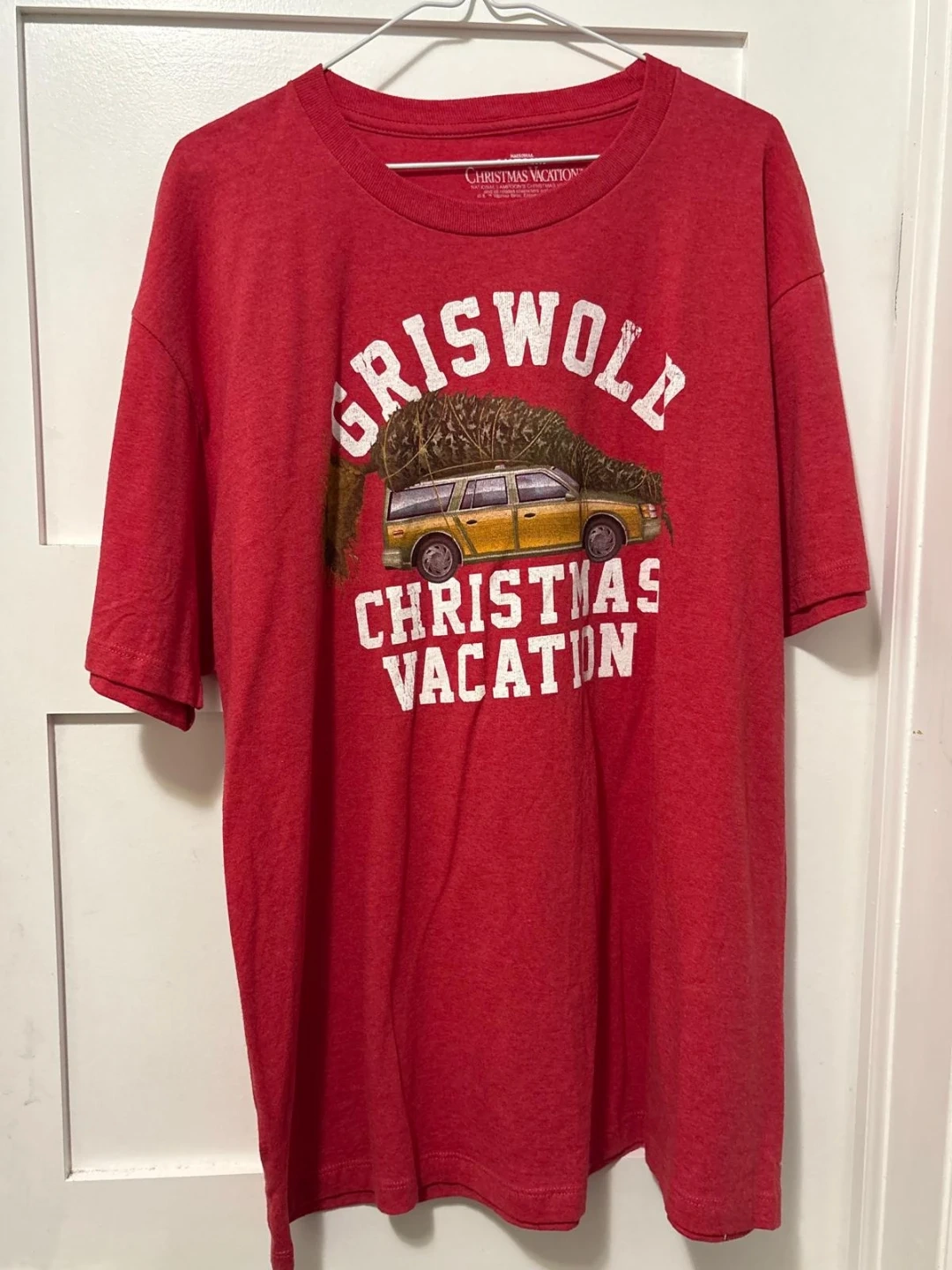 Selling a red Griswold Family Christmas Vacation t-shirt in size L. It's in great condition and features the classic car with the Christmas tree on top. A fun shirt for the holidays!