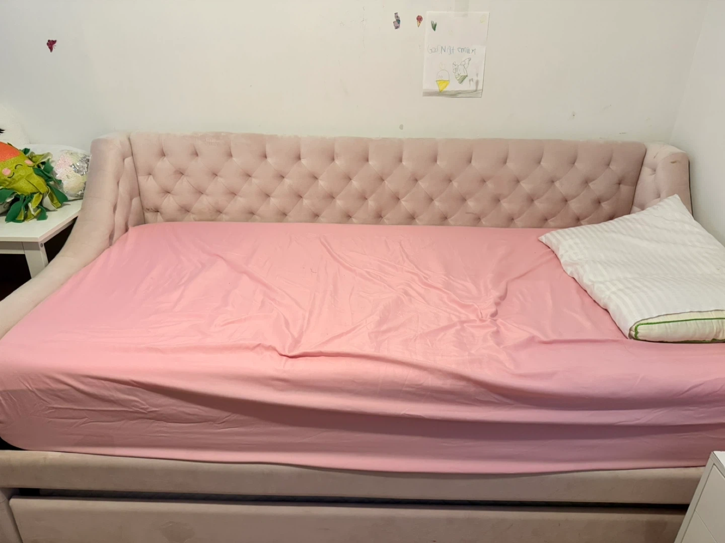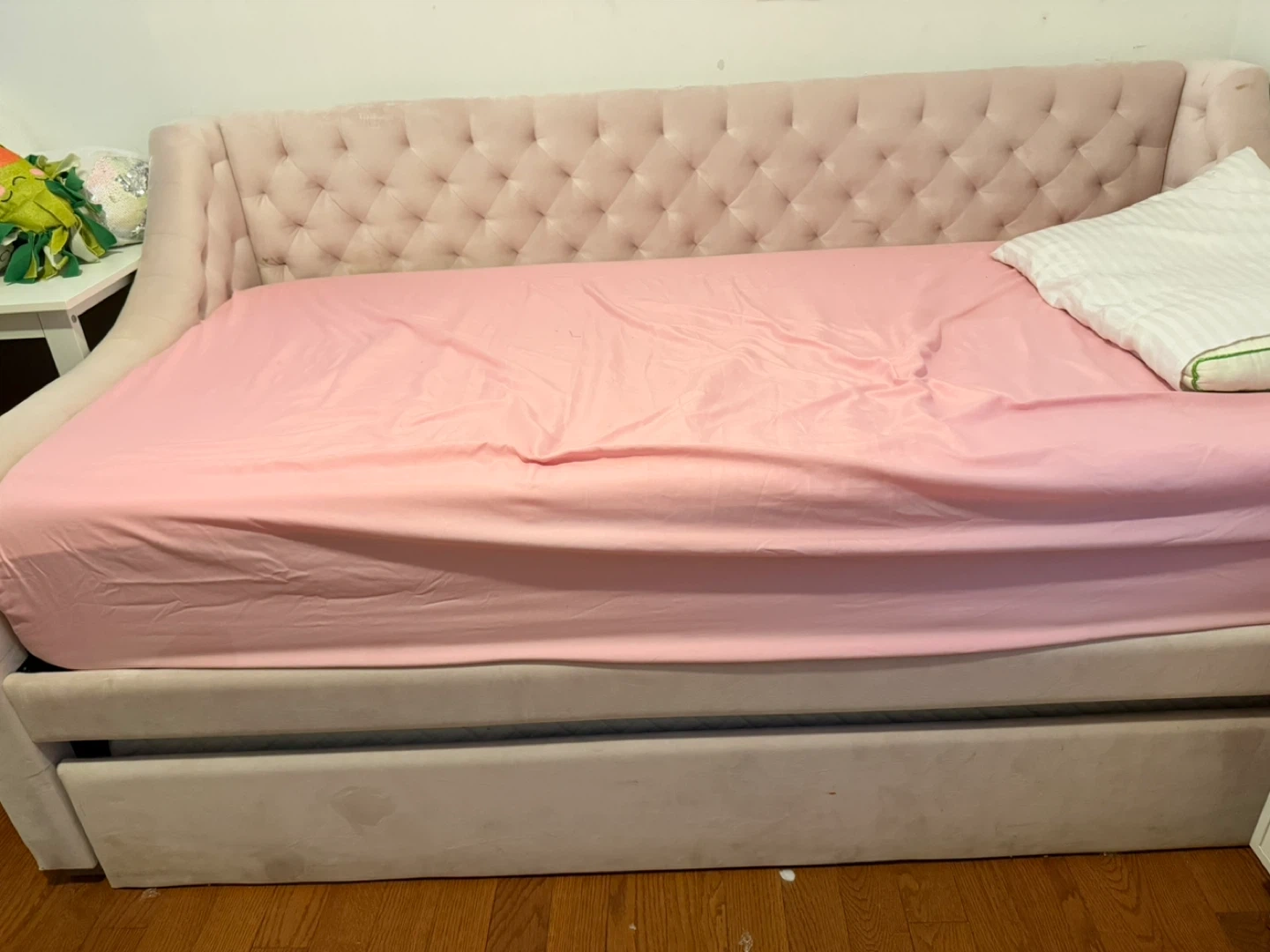 Pink velvet upholstered daybed with a tufted headboard and a pull-out trundle. It's a stylish and space-saving furniture piece. The trundle pulls out smoothly for extra sleeping space.