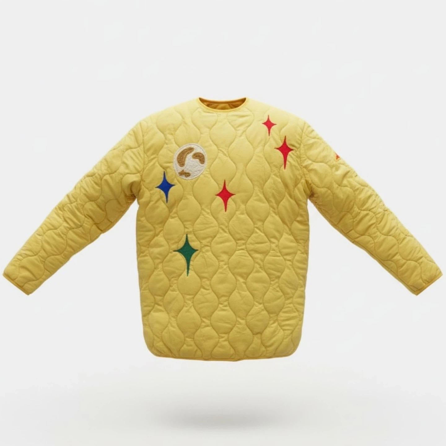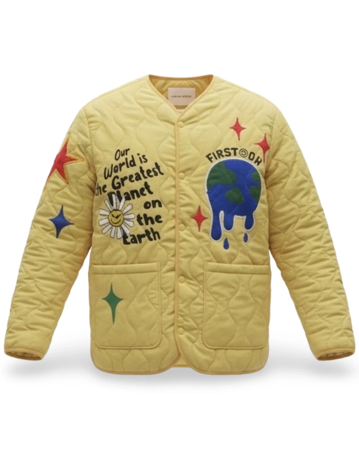 This FIRST ROW unisex quilted jacket is yellow with a celestial print. It features an embroidered "Our World is the Greatest Planet on Earth" graphic and a melting globe design. Fully lined and quilted for warmth.