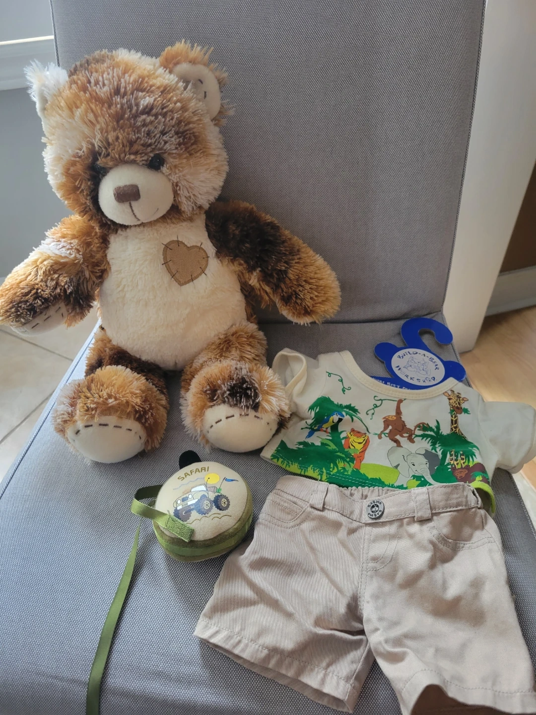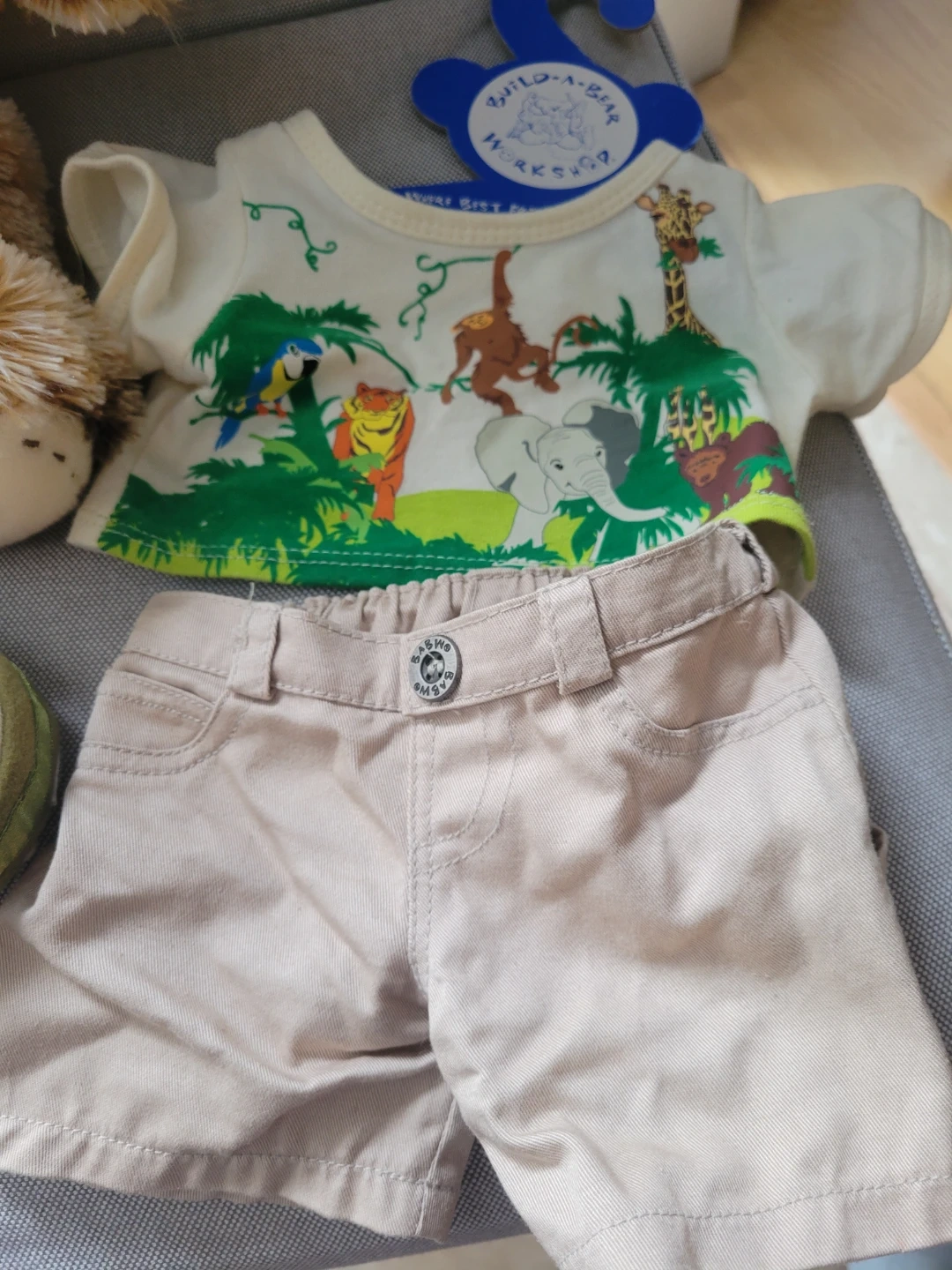 This is a cute safari-themed outfit for a stuffed animal from Build-A-Bear Workshop. It includes a t-shirt with jungle animals and a pair of khaki shorts. The outfit is perfect for dressing up your favourite plush pal for an adventure!