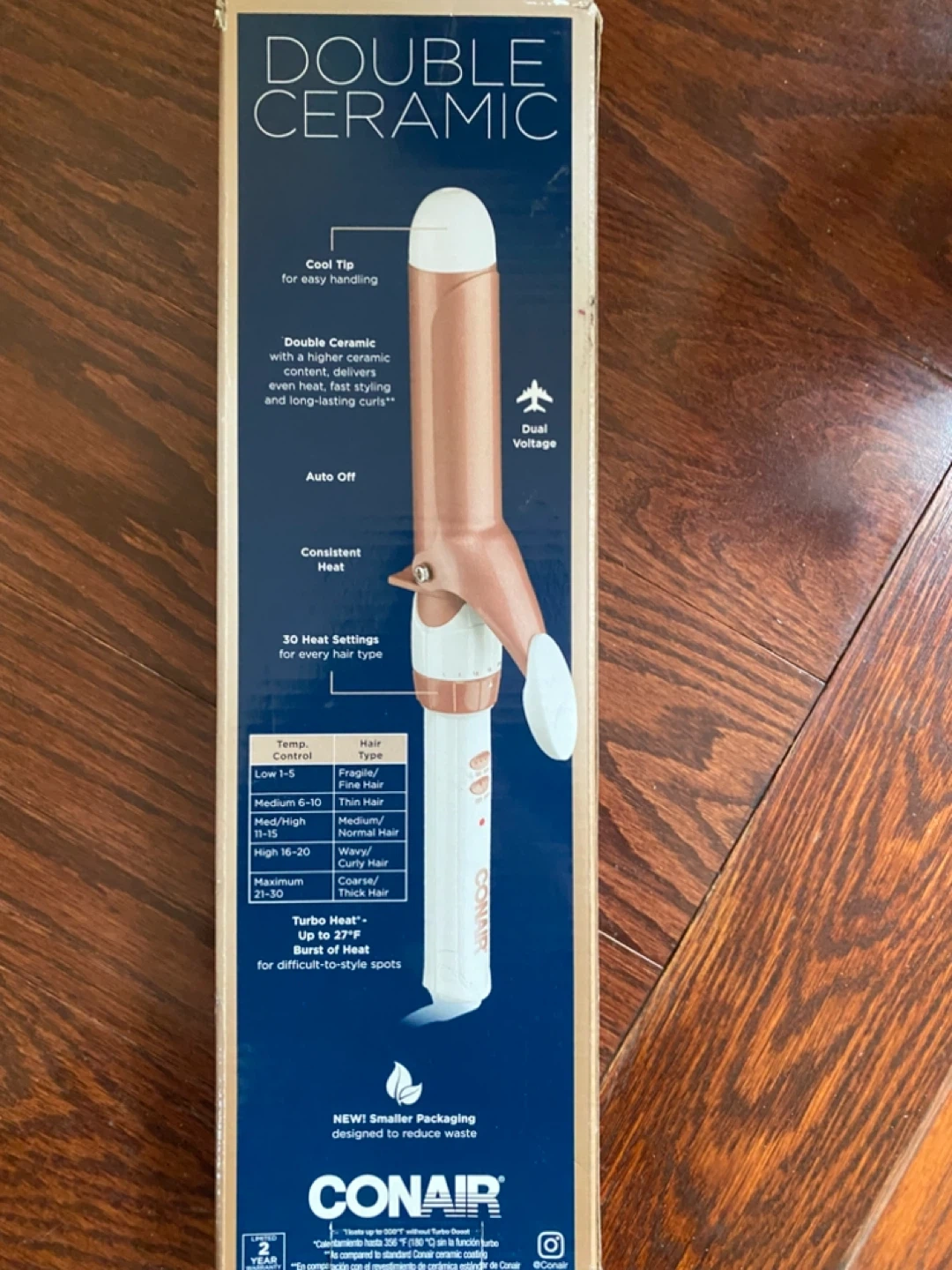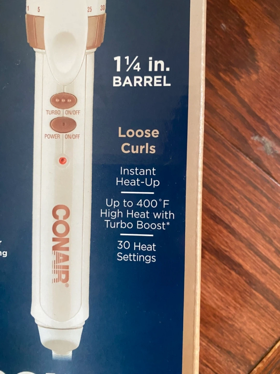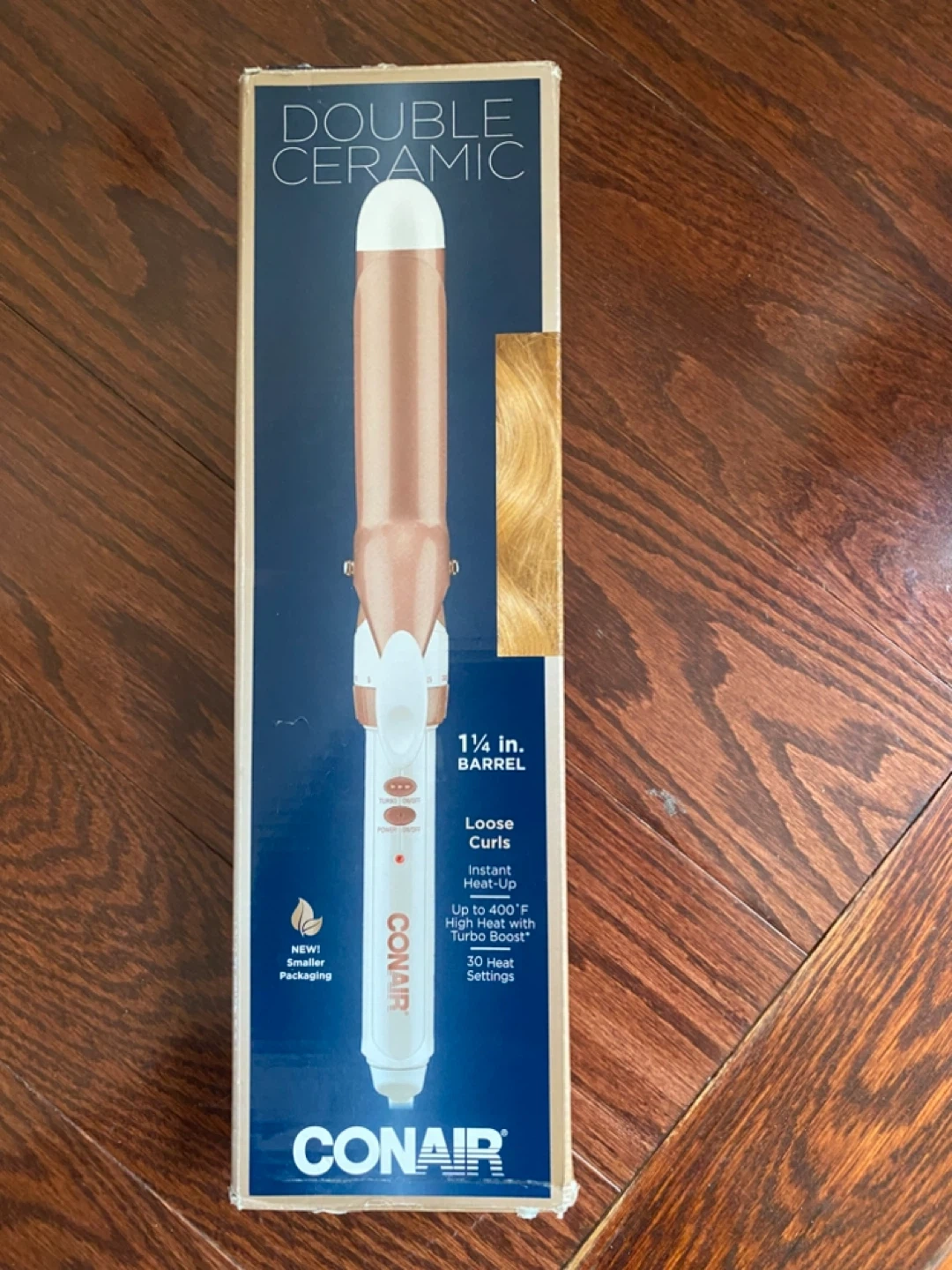Conair Double Ceramic curling iron with a 1 1/4 inch barrel. It features instant heat-up and up to 400°F high heat with 30 heat settings. This tool is designed for creating loose curls.