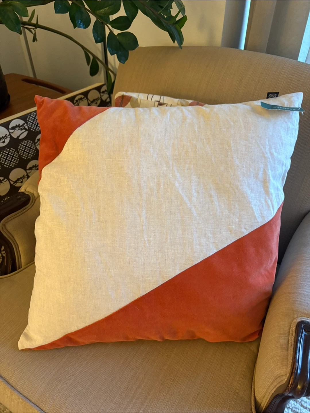 Add a touch of style to your home with this decorative pillow from Simons! It's in great shape and measures 50x50cm. The original tag is still attached, and it shows it was originally bought for $50. The pillow features a unique design with a blend of neutral and orange tones in linen and velvet.