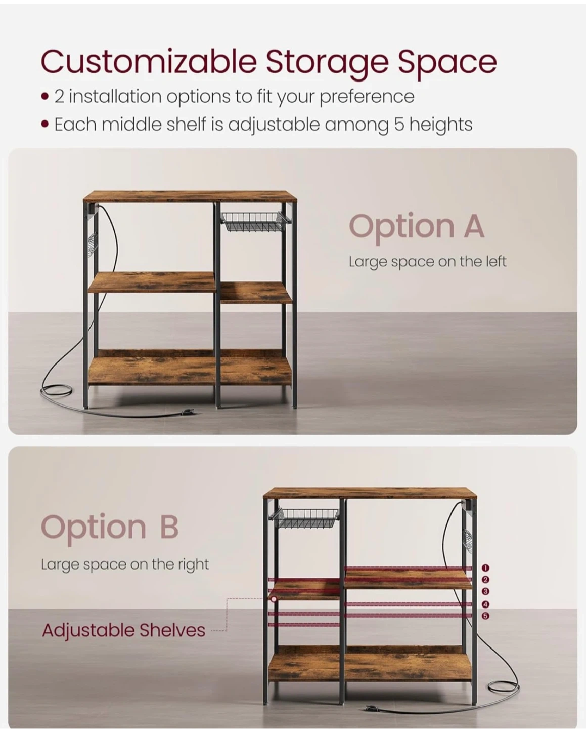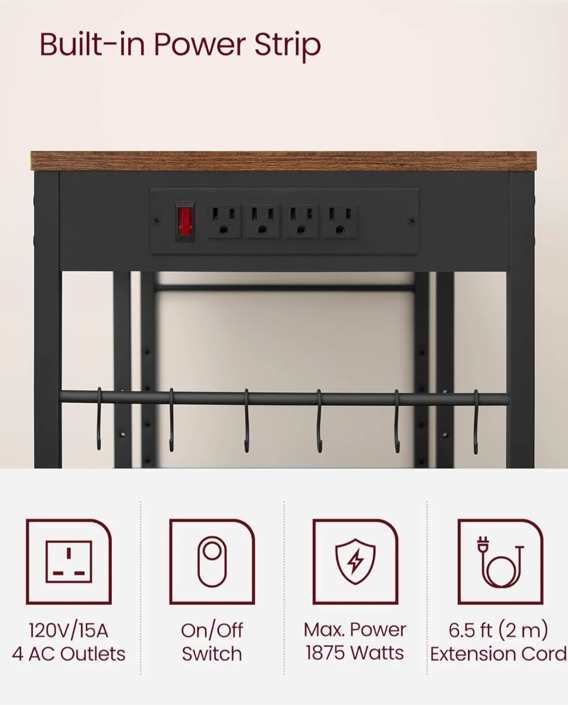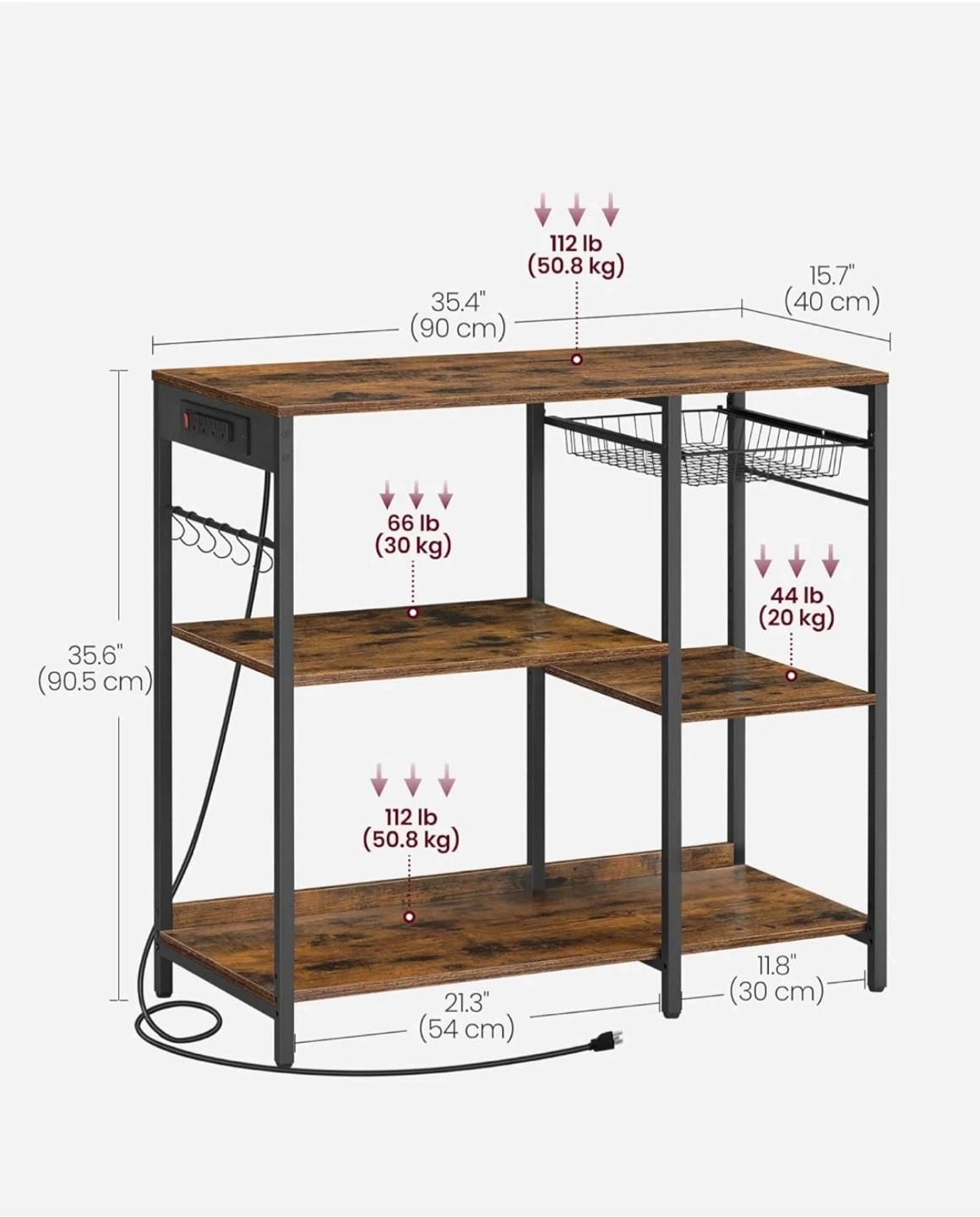 This baker's rack offers customizable storage with adjustable shelves. It's designed with a rustic brown engineered wood finish and black metal frame. The unit includes a built-in power strip with 4 AC outlets and a 6.5 ft extension cord, plus hanging hooks and a wire basket. Max weight capacity for the top shelf is 112 lbs, middle shelf 66 lbs, and bottom shelf 112 lbs.
