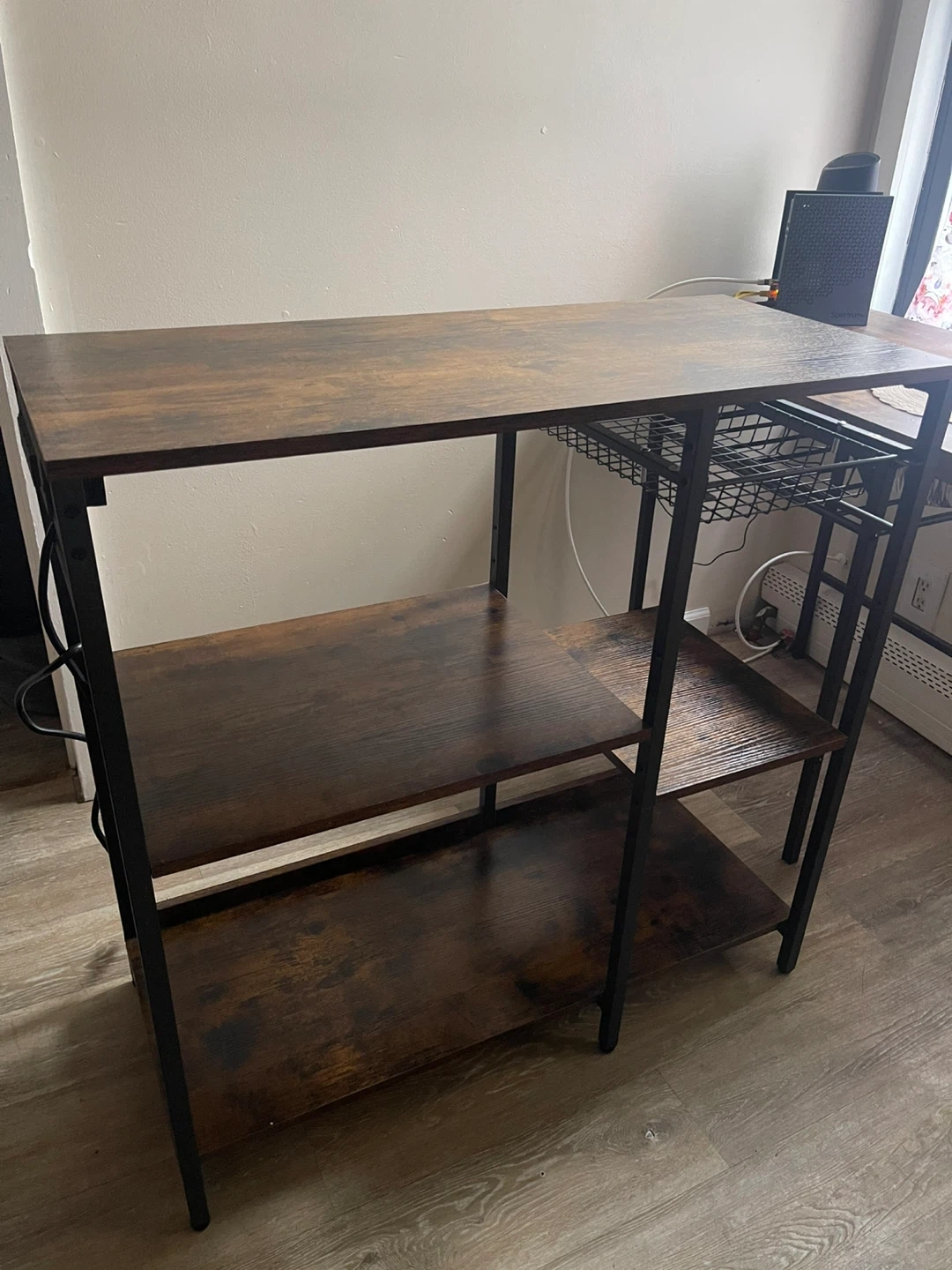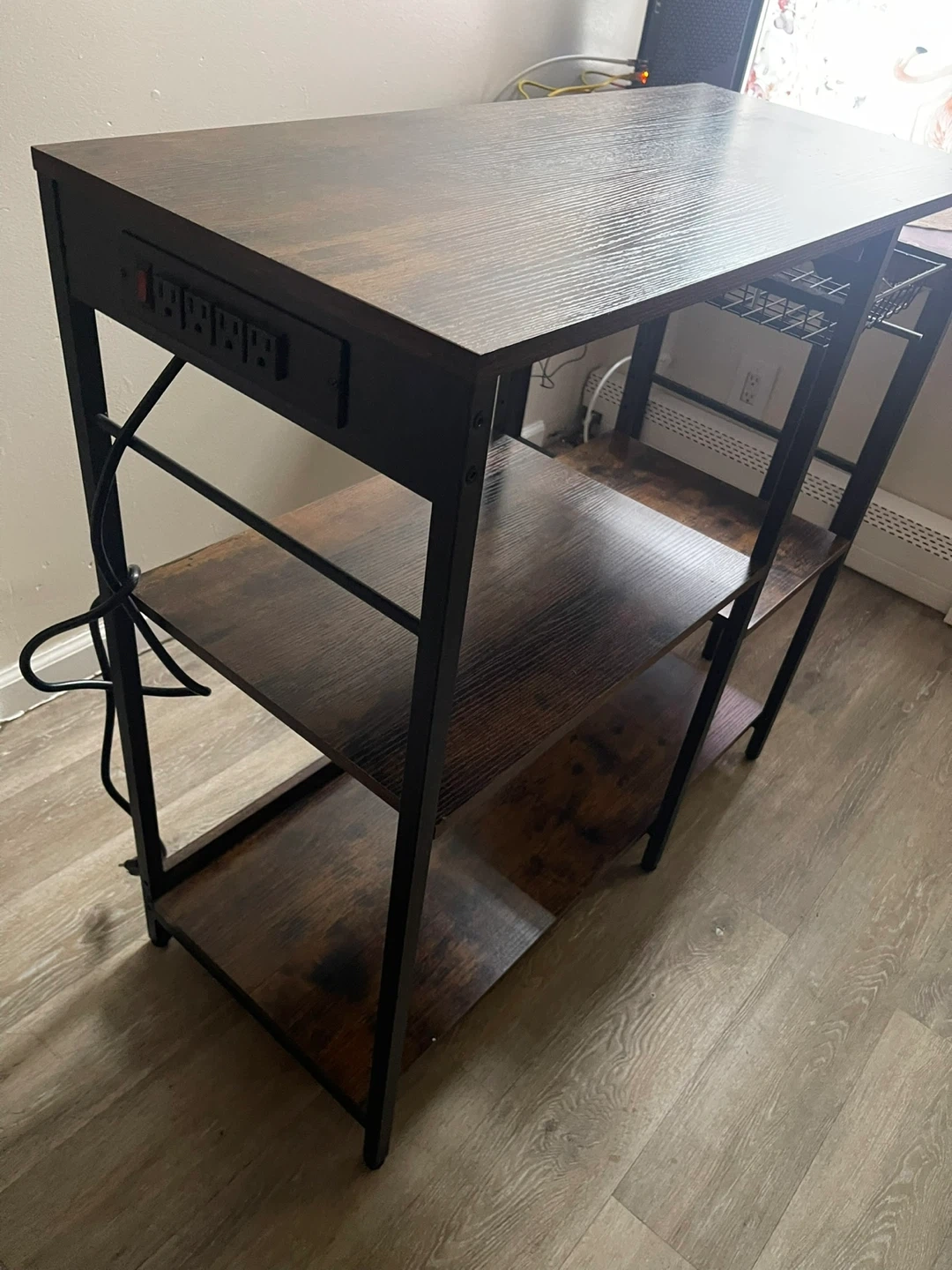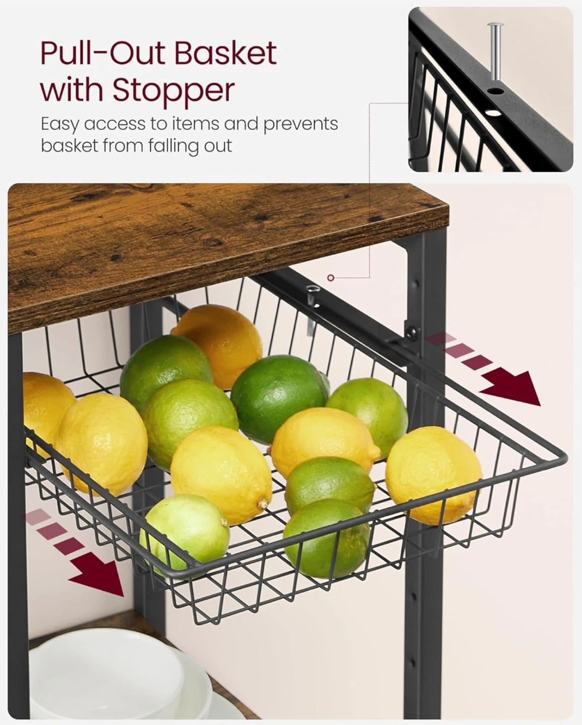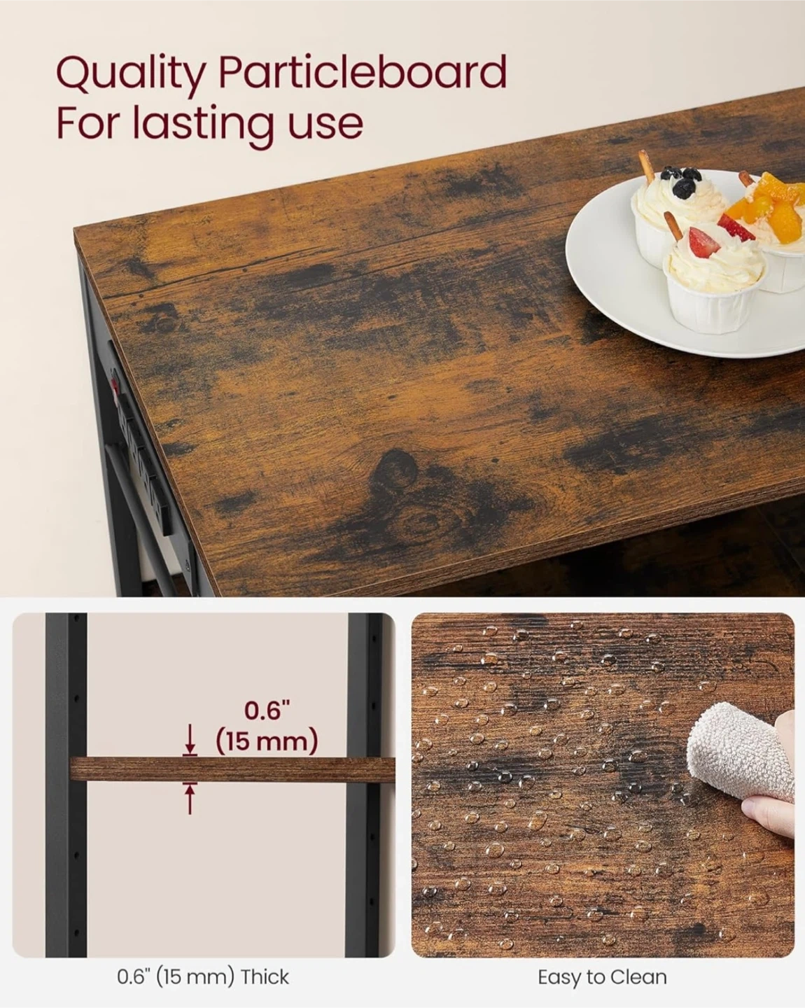 This baker's rack offers customizable storage with adjustable shelves. It's designed with a rustic brown engineered wood finish and black metal frame. The unit includes a built-in power strip with 4 AC outlets and a 6.5 ft extension cord, plus hanging hooks and a wire basket. Max weight capacity for the top shelf is 112 lbs, middle shelf 66 lbs, and bottom shelf 112 lbs.