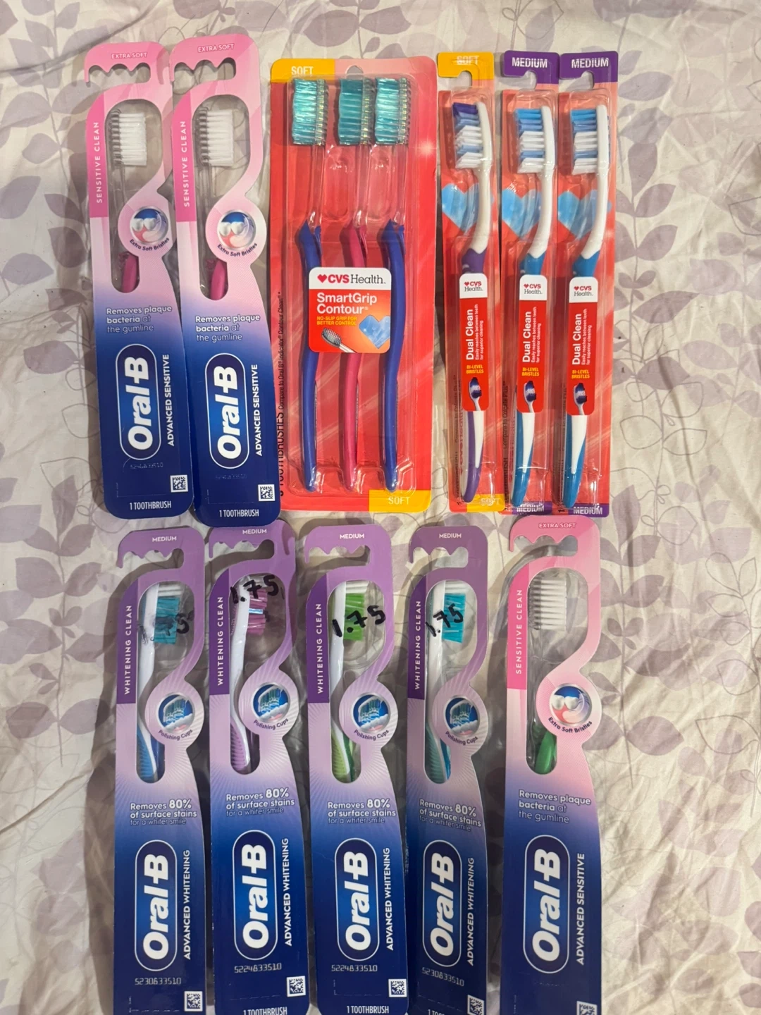 21From $1 to $3 I have a variety pack of Oral-B toothbrushes available. You'll find different types like Advanced Whitening, Sensitive Clean, and Dual Clean. There are soft, medium, and extra soft bristles to choose from. Great for stocking up!